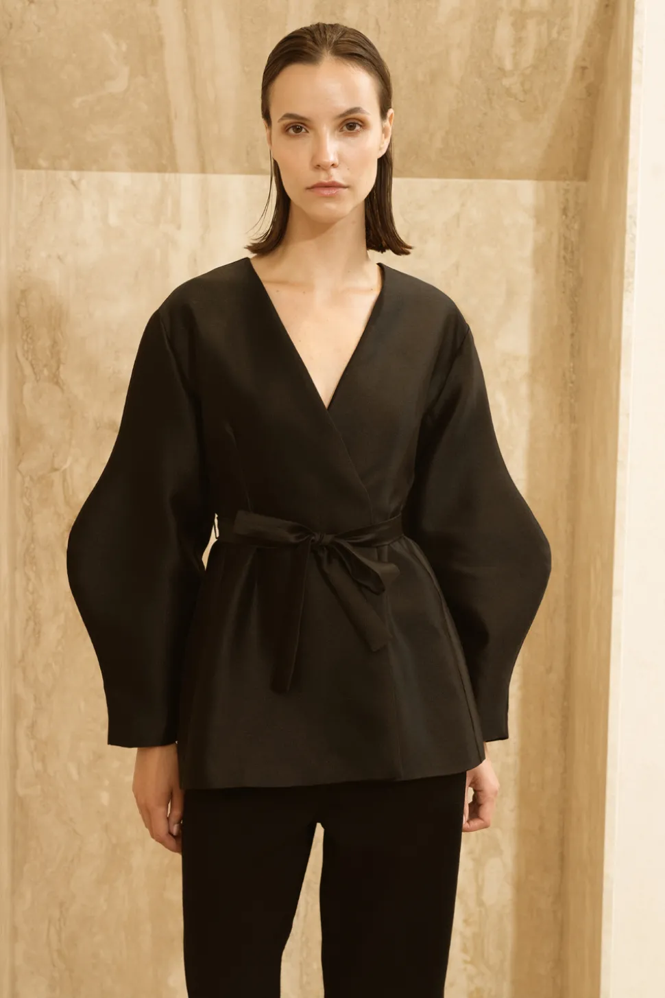 Satinkavaj i en sidenblandning med ballongärm och ett bälte i midjan.