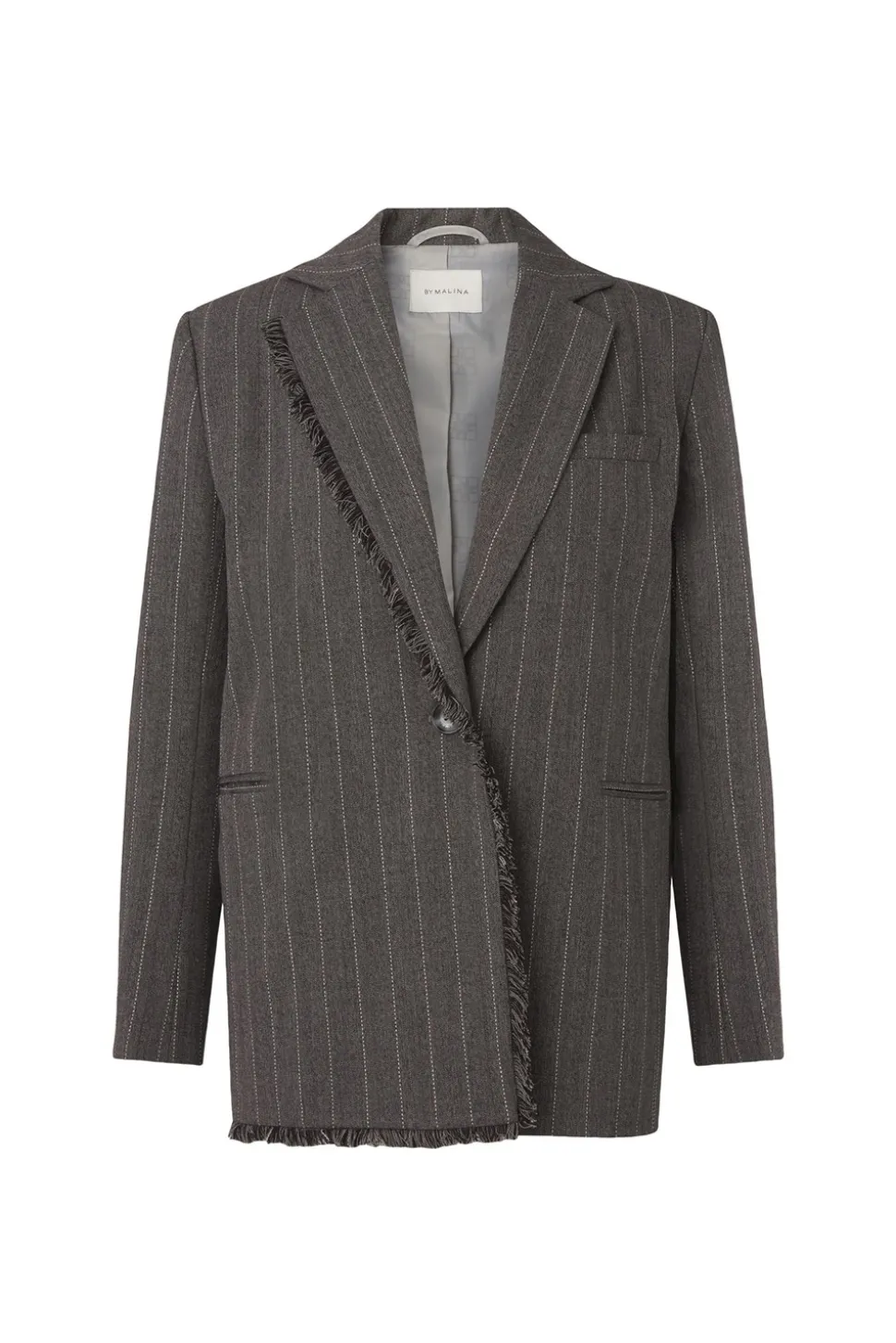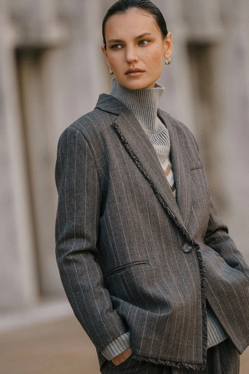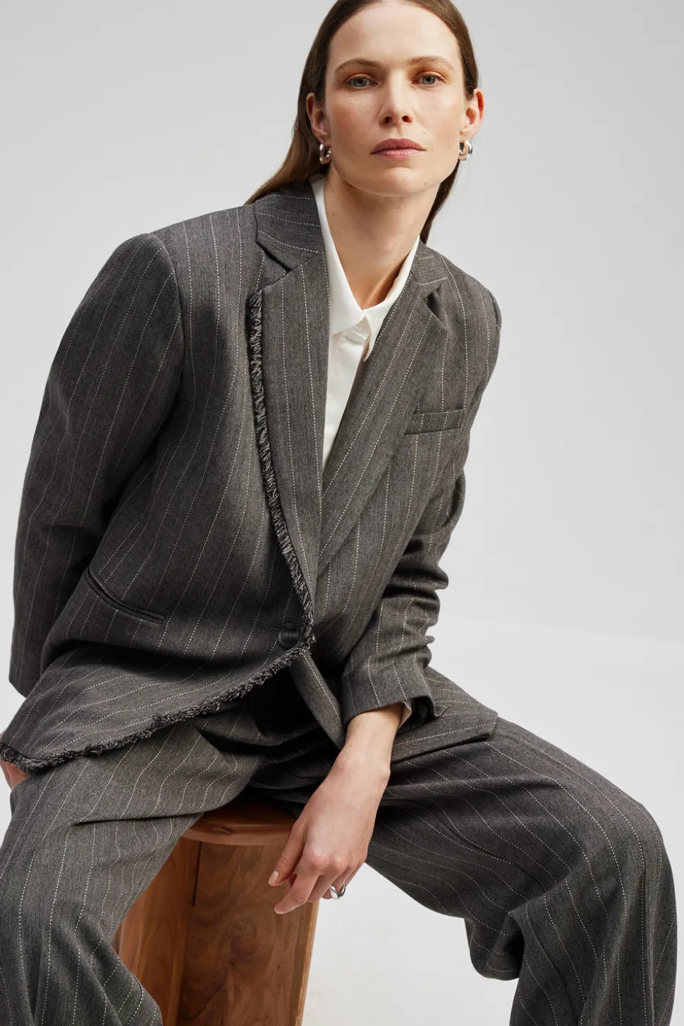 Rak kavaj med fransdetalj. Kommer i ett kritstrecksrandigt tyg.
