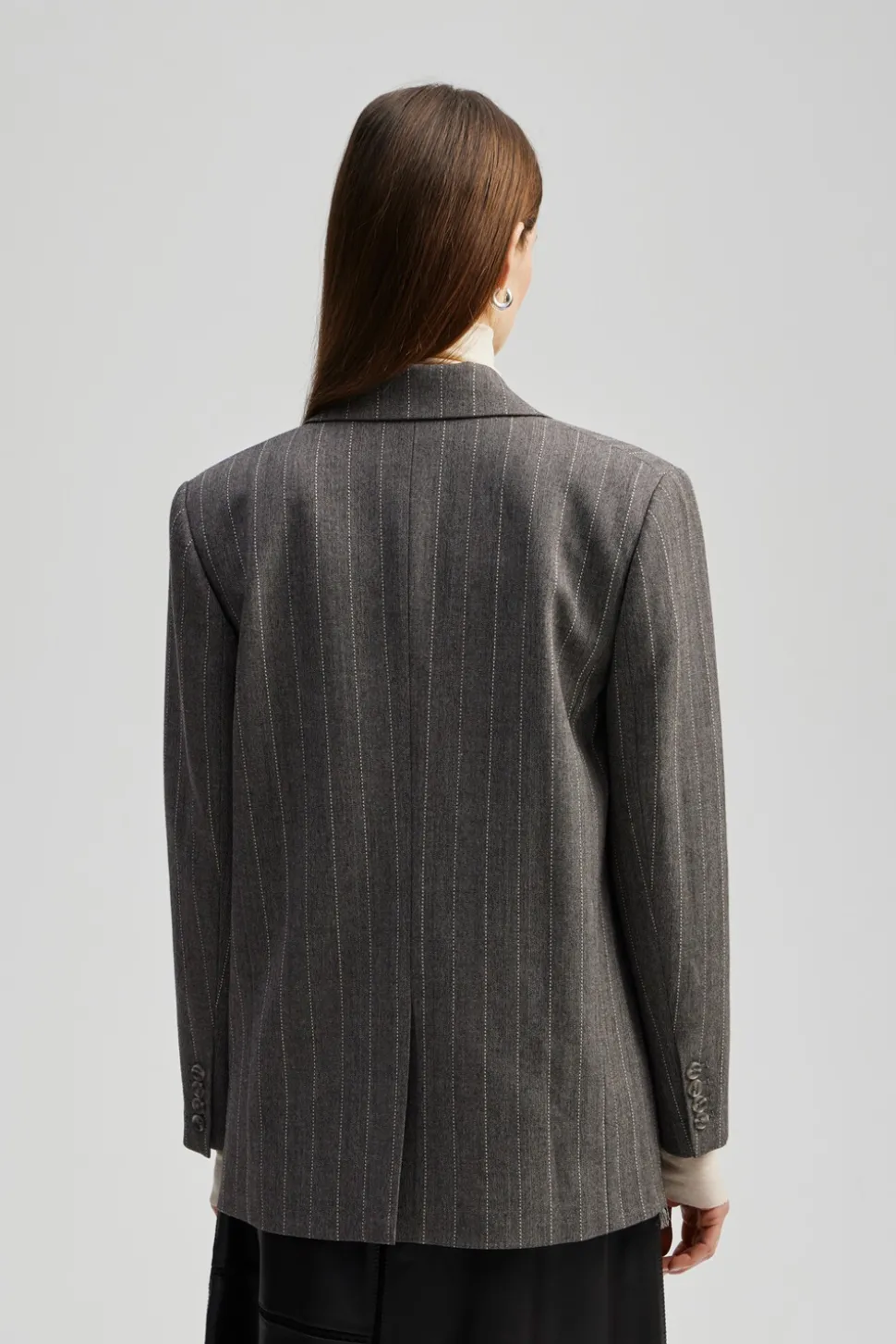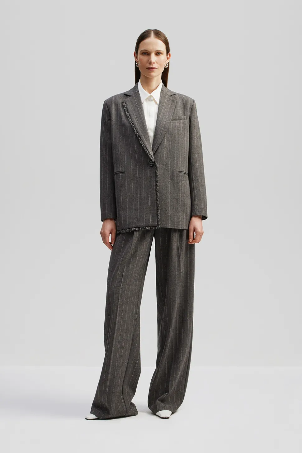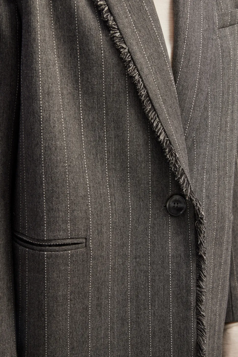 Rak kavaj med fransdetalj. Kommer i ett kritstrecksrandigt tyg.