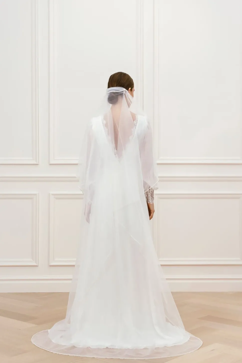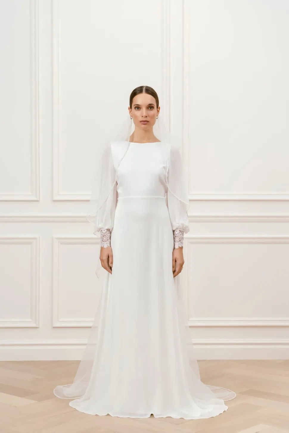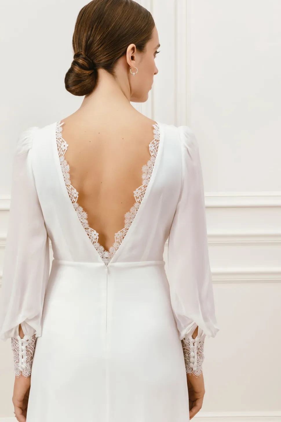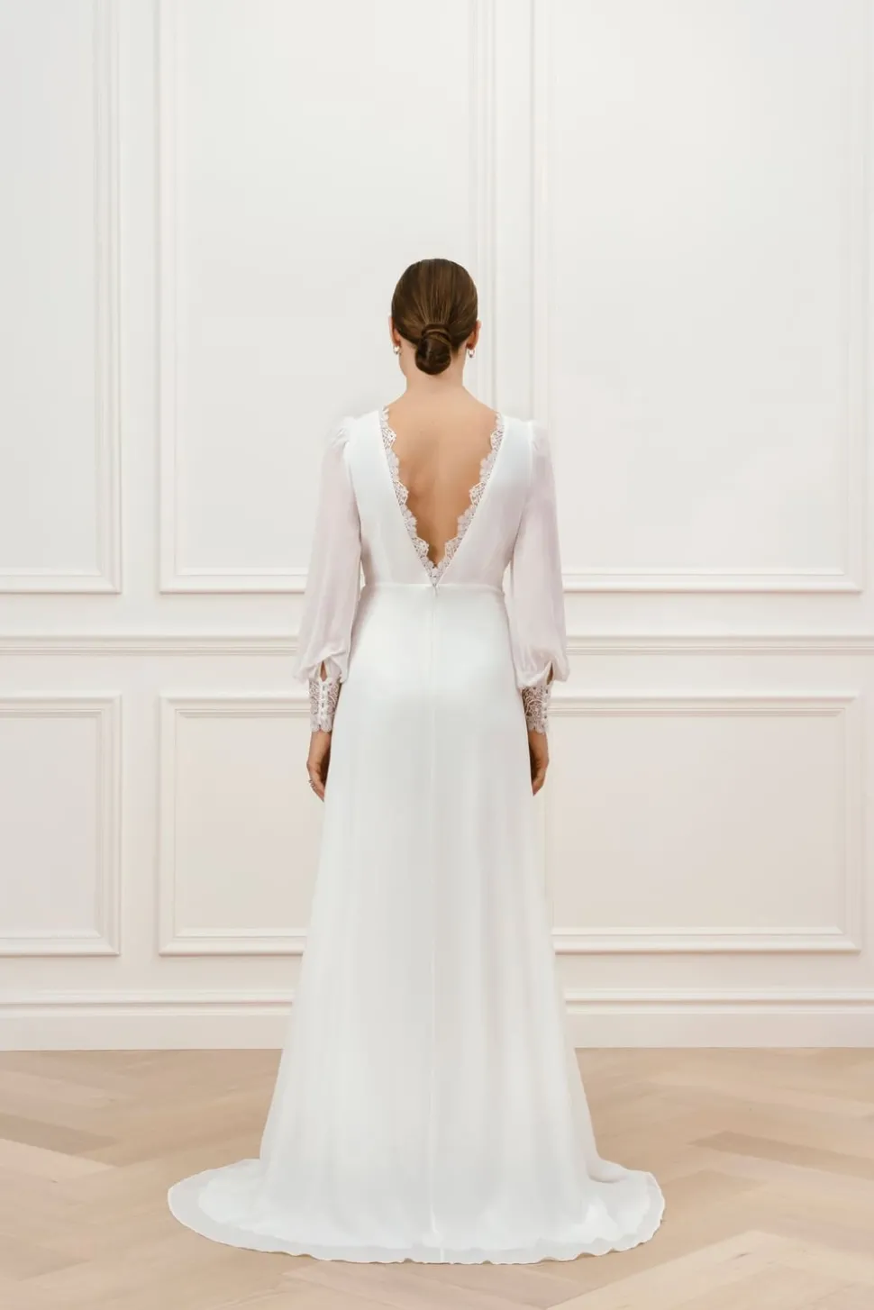 Bröllopsklänning i chiffong med långa ärmar, spetsmuddar, klädda knappar och detaljerad öppen rygg och båtringning.