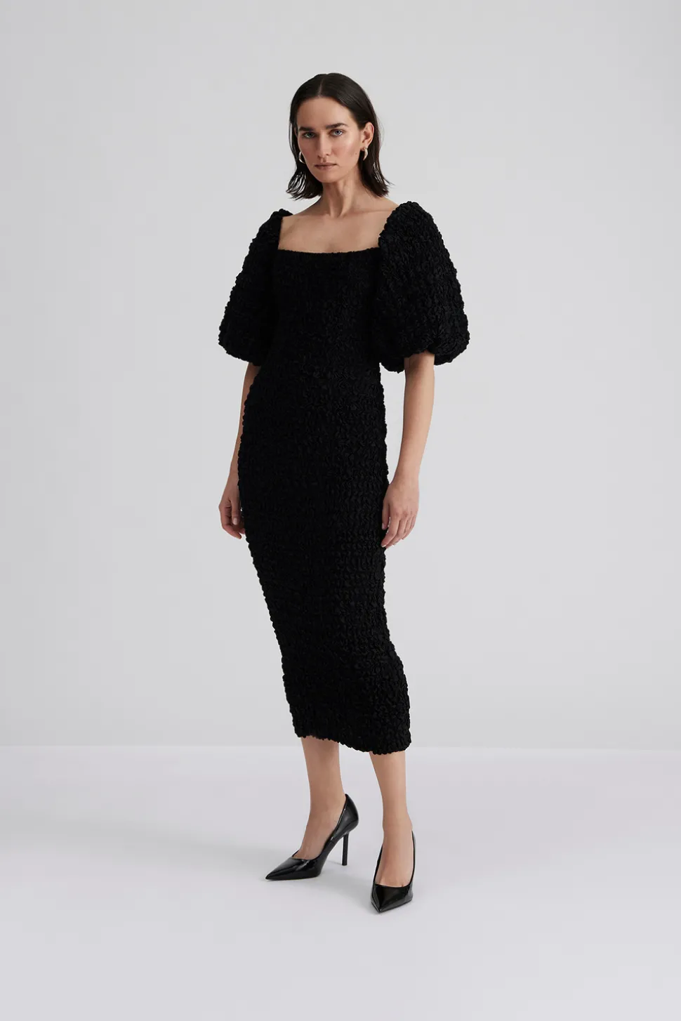 Smockad midiklänning med korta puffiga ärmar och en fyrkantig halsringning.