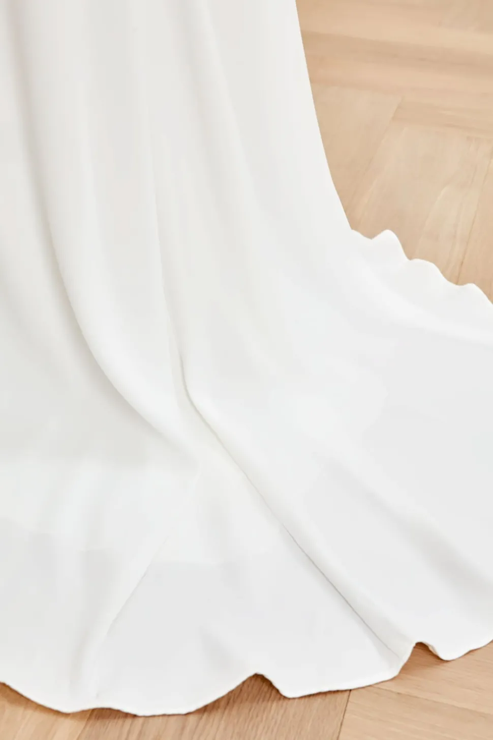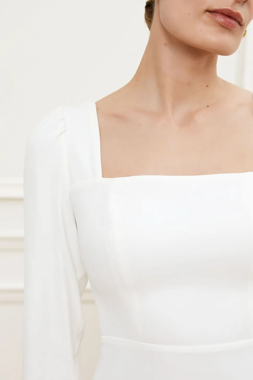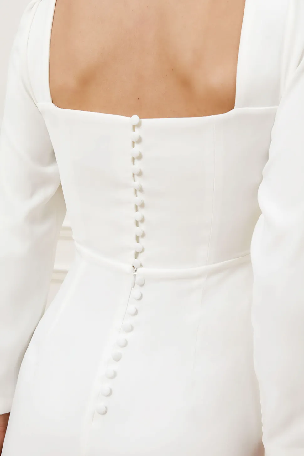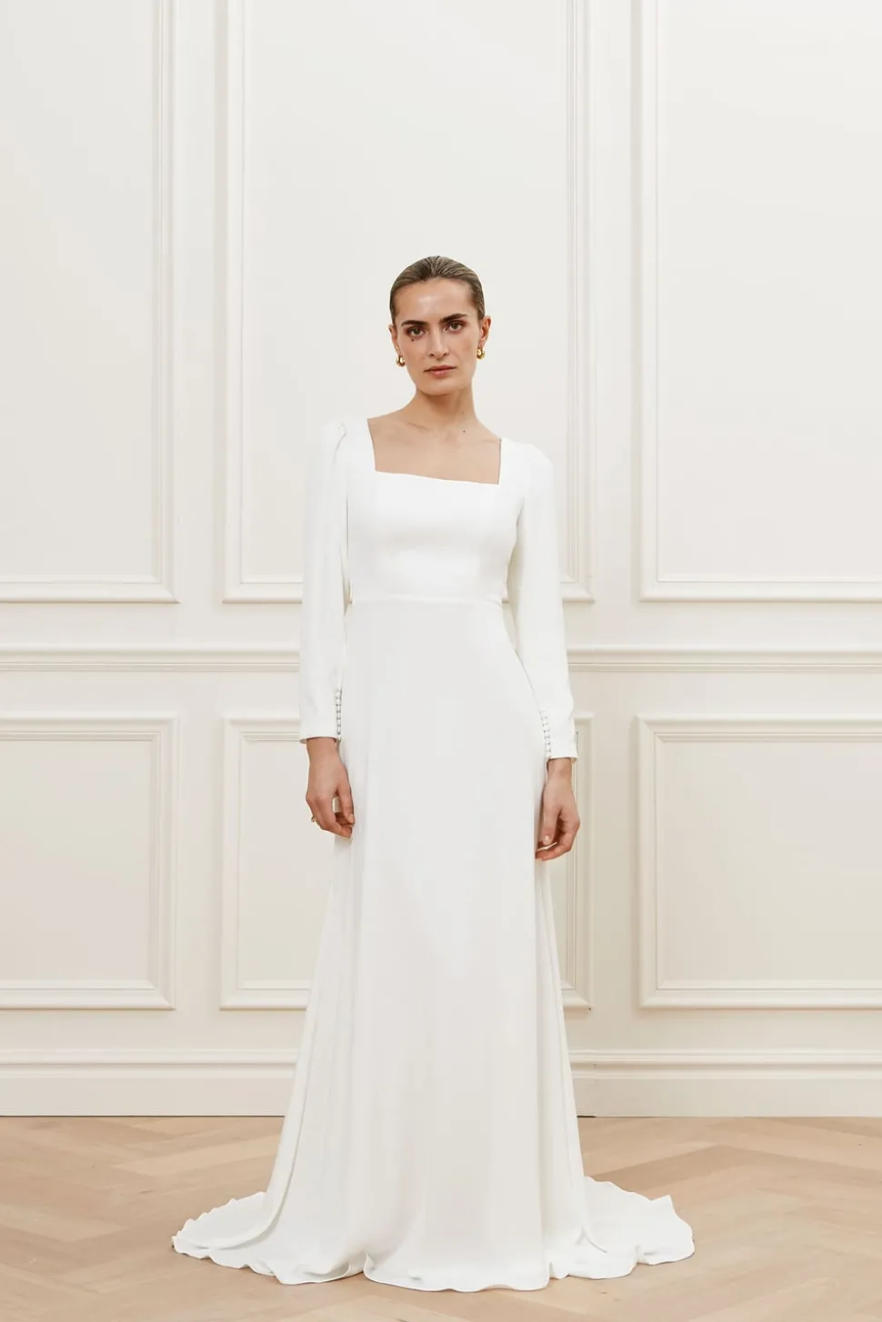Bröllopsklänning med fyrkantig halsringning, långa ärmar och en figurnära passform. Fyrkantig öppen rygg som är dekorerad med klädda knappar.