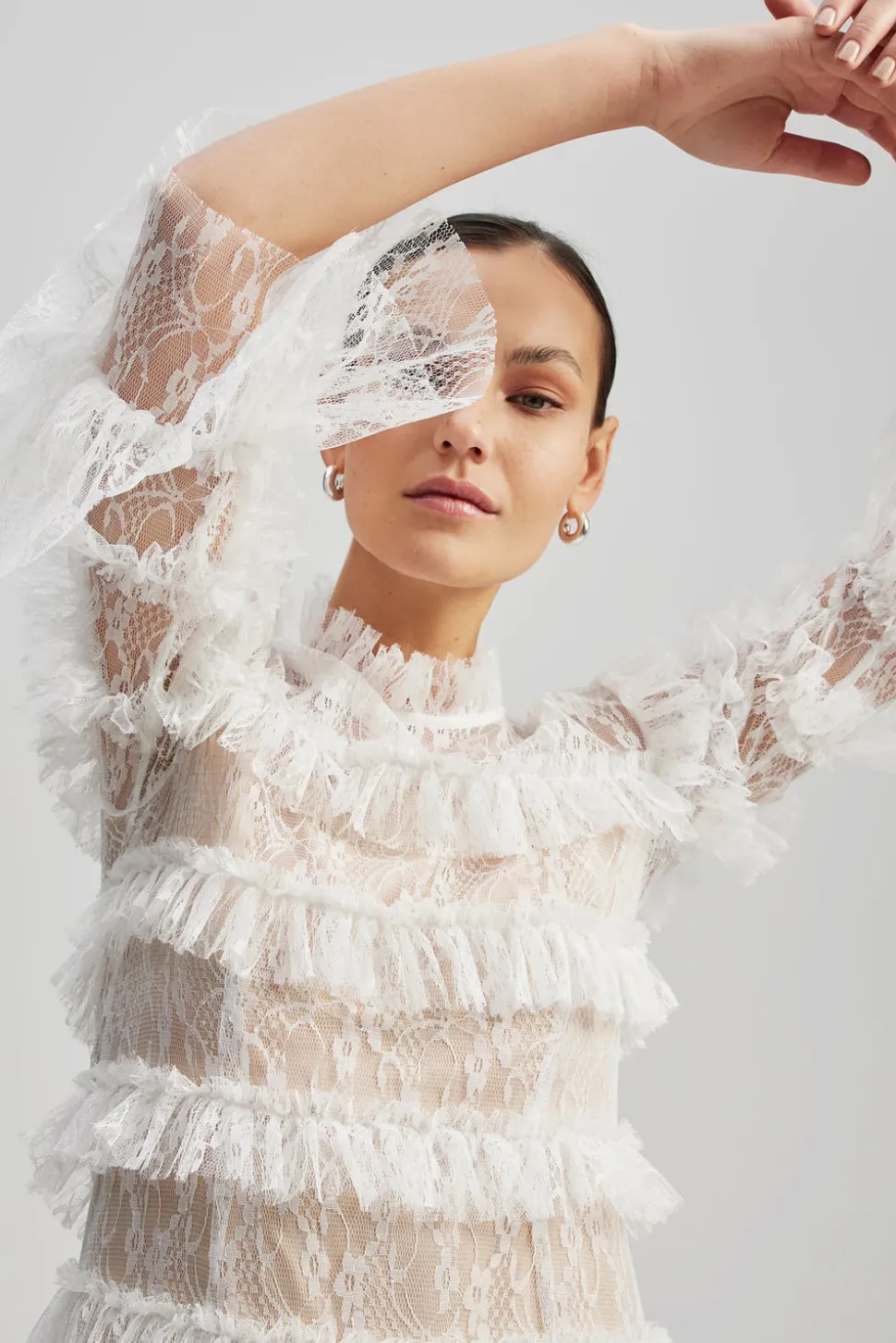 Maxiklänning med transparenta spetspartier runt hals och ärmar och har foder på resten. Feminim siluett med hög krage.