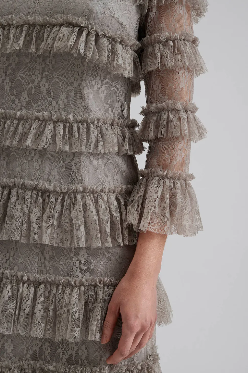 Miniklänning i spets med hög krage, långa ärmar och kort kjol täckt i volanger.