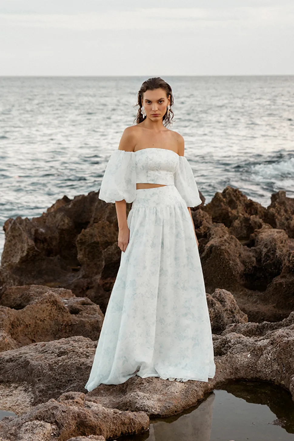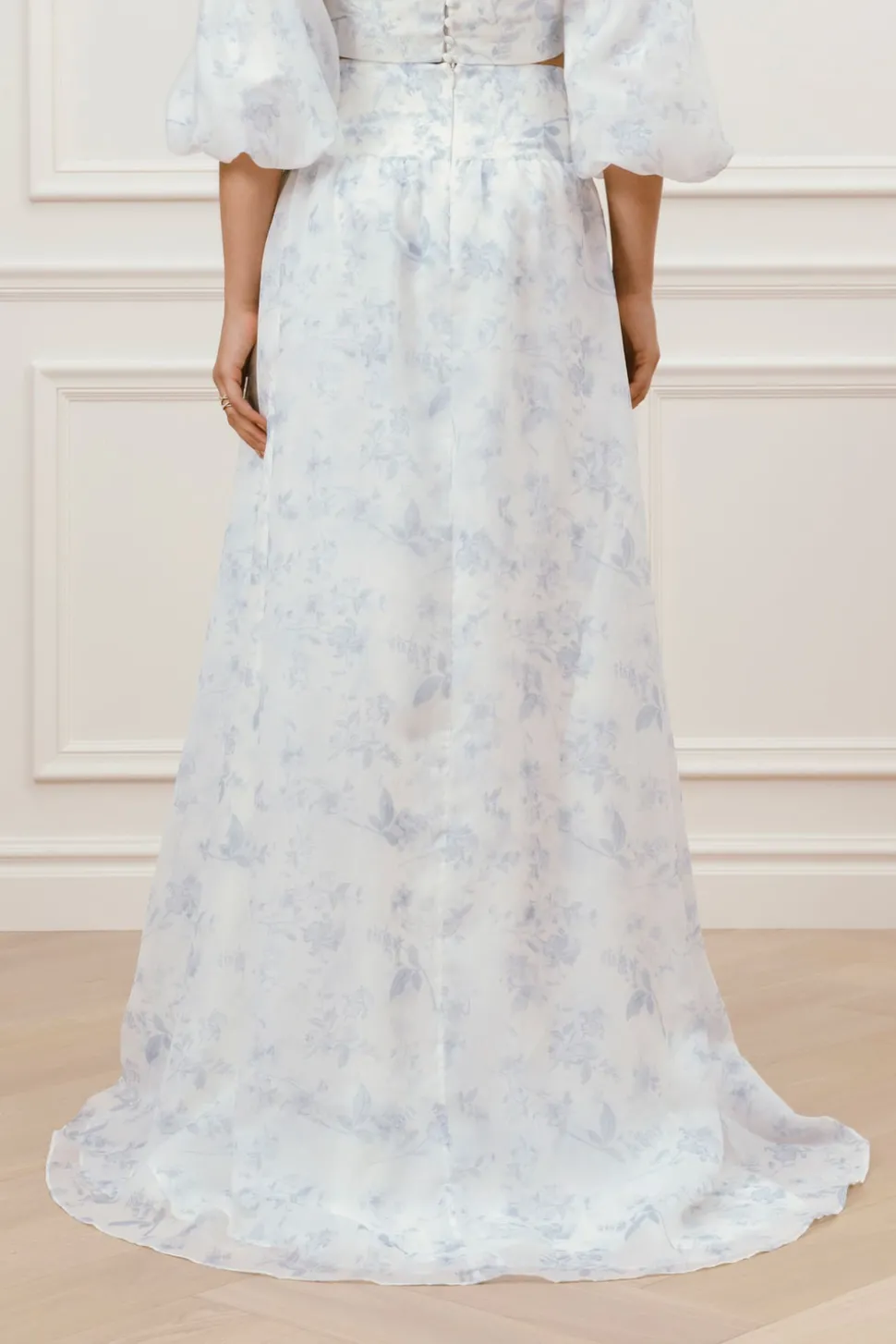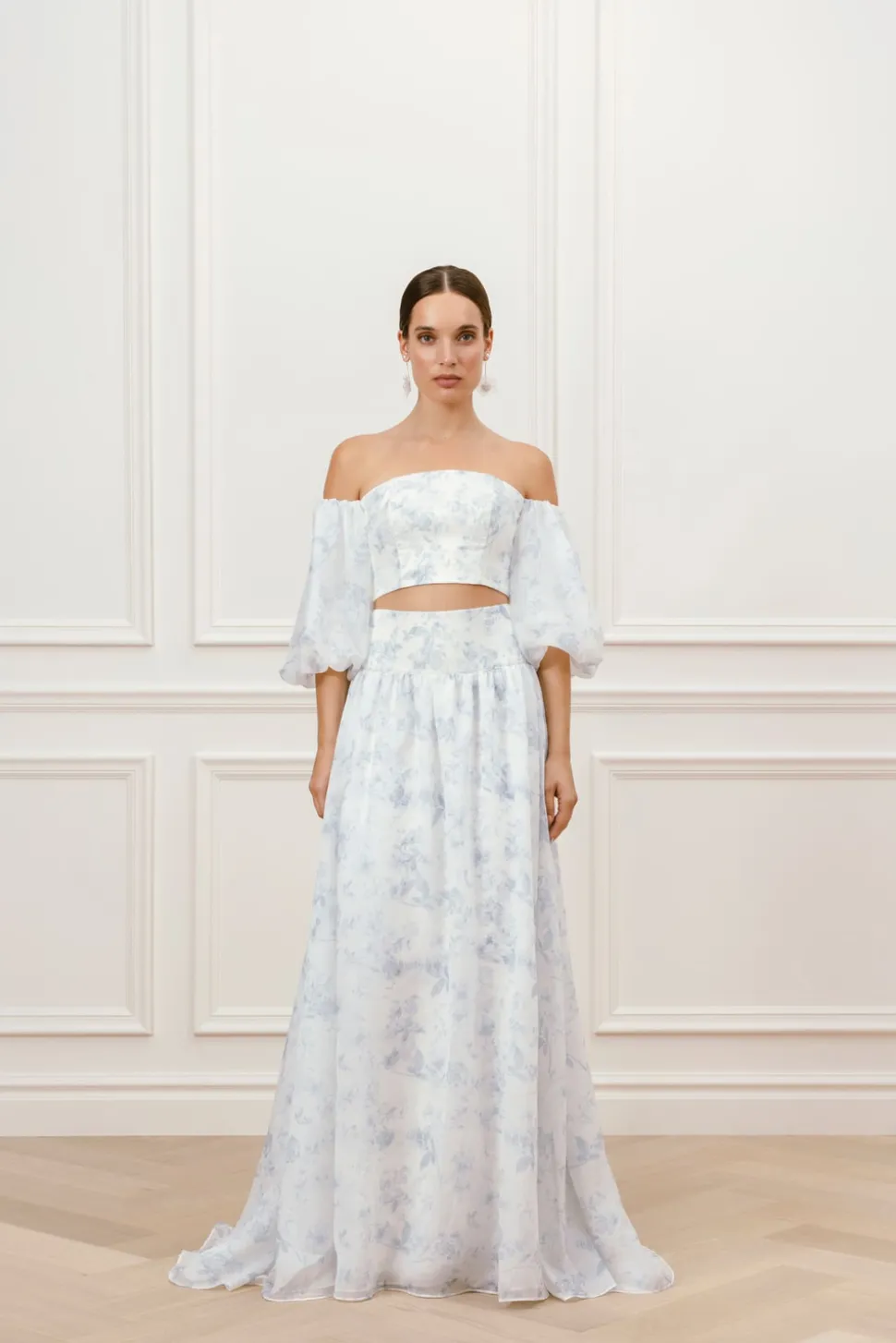 En voluminös kjol med vårat vackra blommönster. Den ultimata sommardrömmen för bruden som letar efter det lilla extra. Styla med Claire topp.