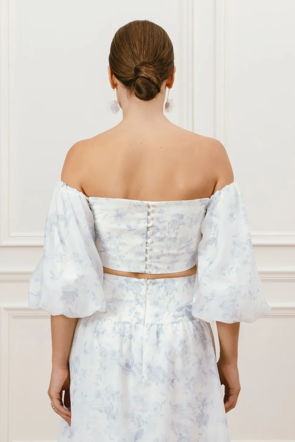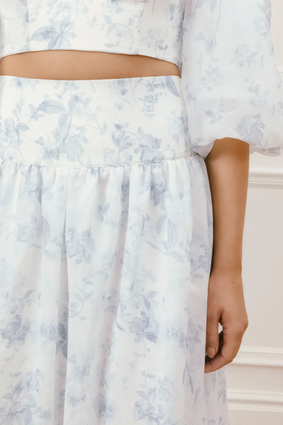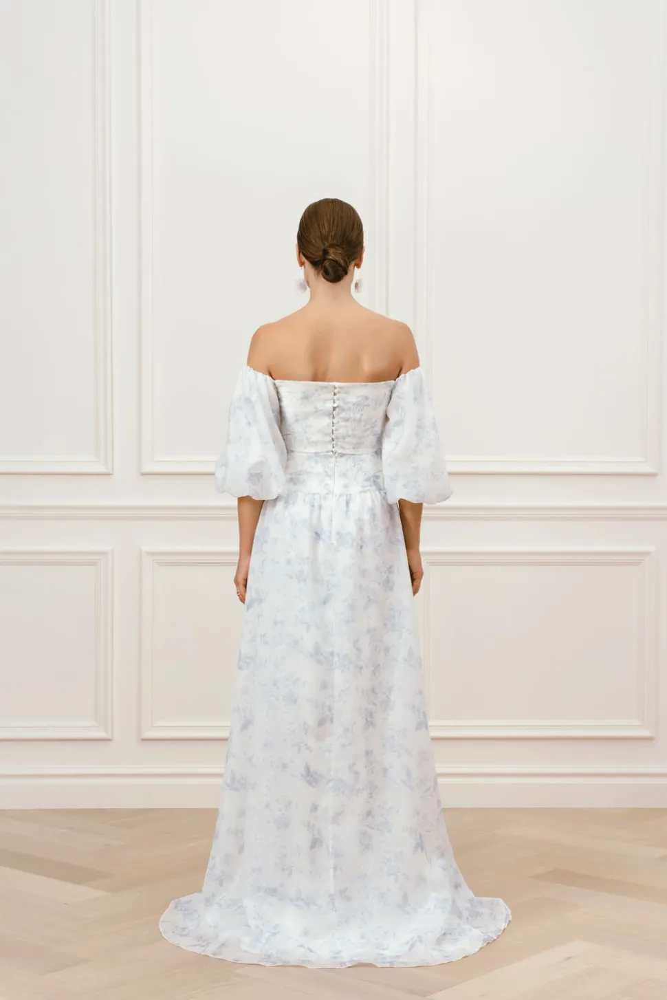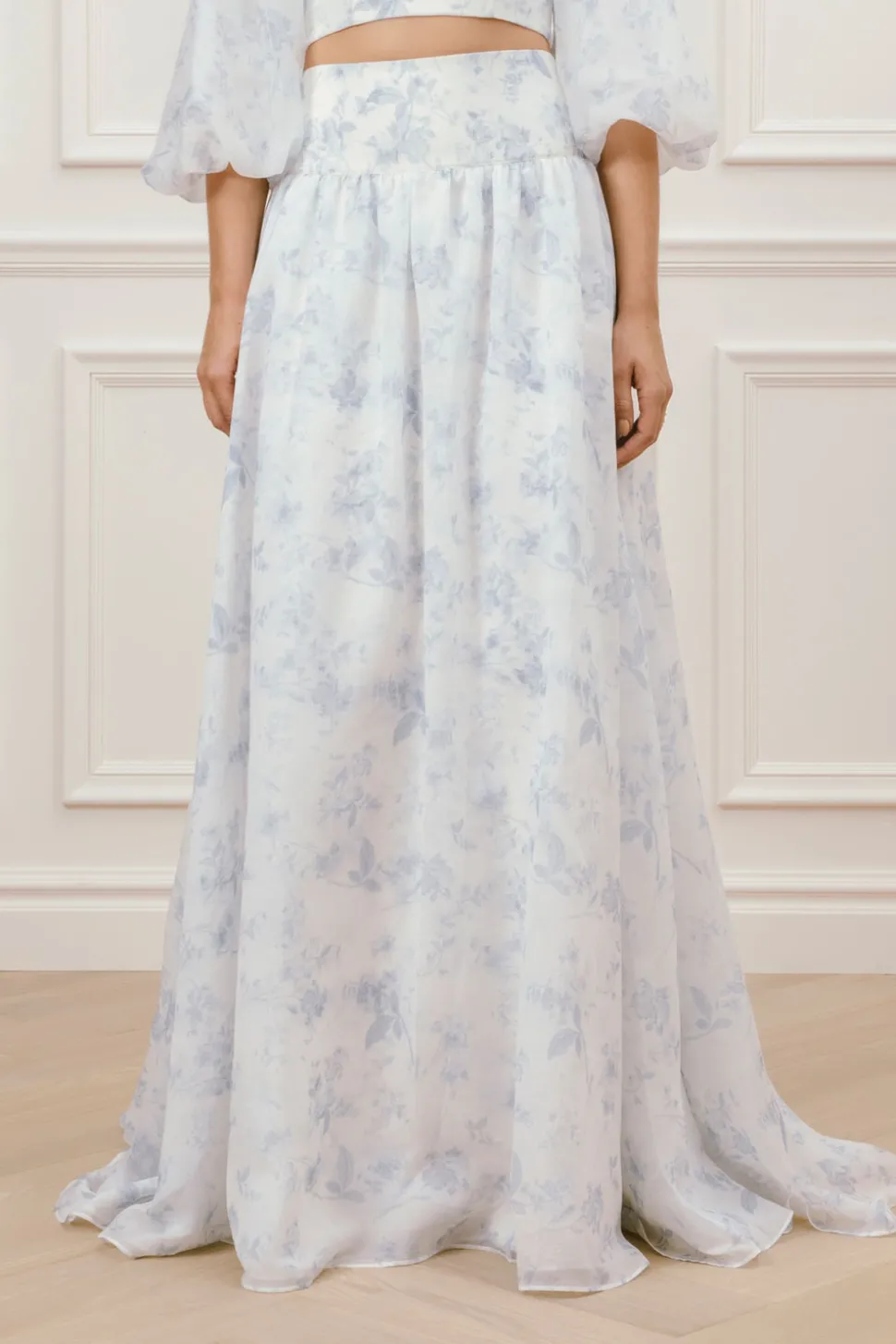 En voluminös kjol med vårat vackra blommönster. Den ultimata sommardrömmen för bruden som letar efter det lilla extra. Styla med Claire topp.