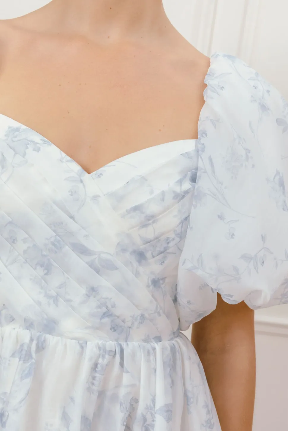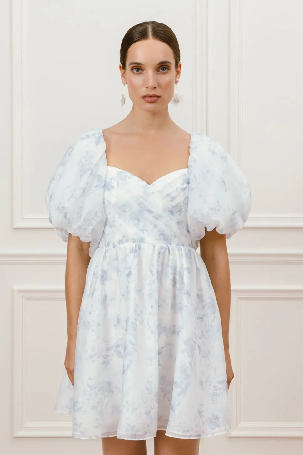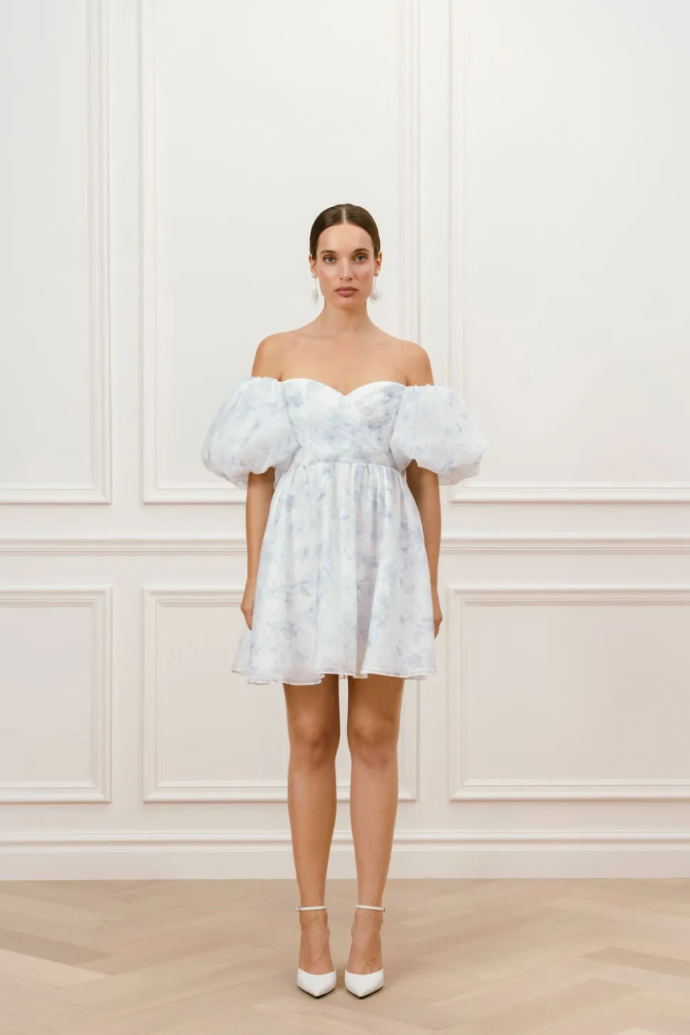 Miniklänning i vårat vackra blommönster. En drömmig klänning med pläteradade detaljer, ballongärmar och voluminös kjol. Den ultimata sommardrömmen för bruden som letar efter det lilla extra eller en festklänning utöver det vanliga.
