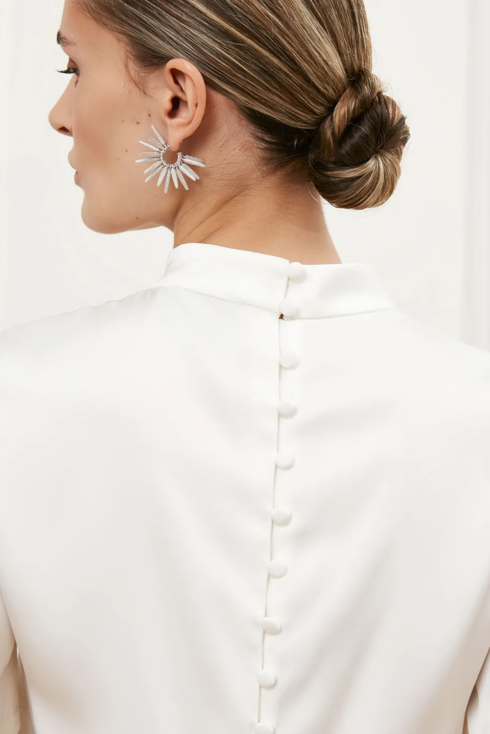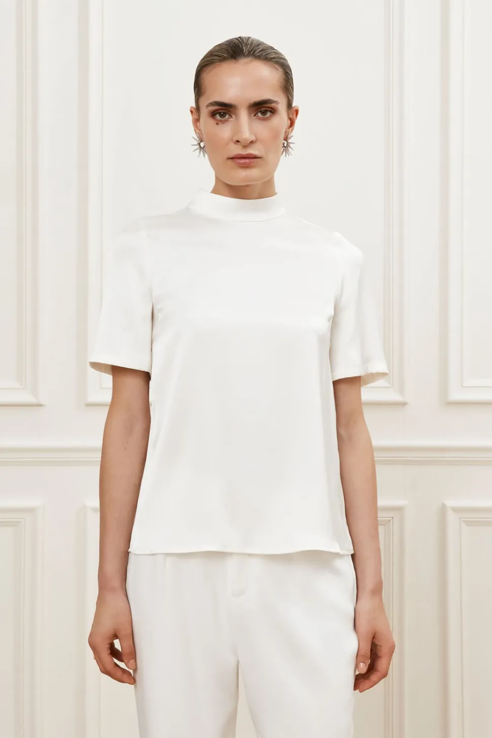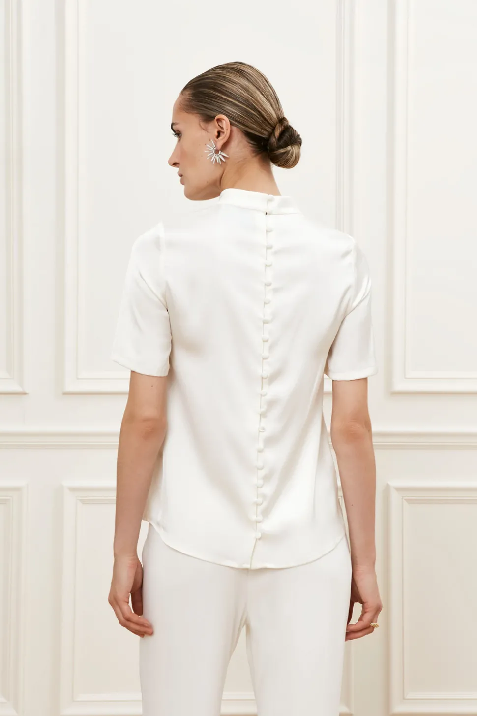 Topp med t-shirt ärm och krage. Lös passform och stängd rygg med klädda knappar.
