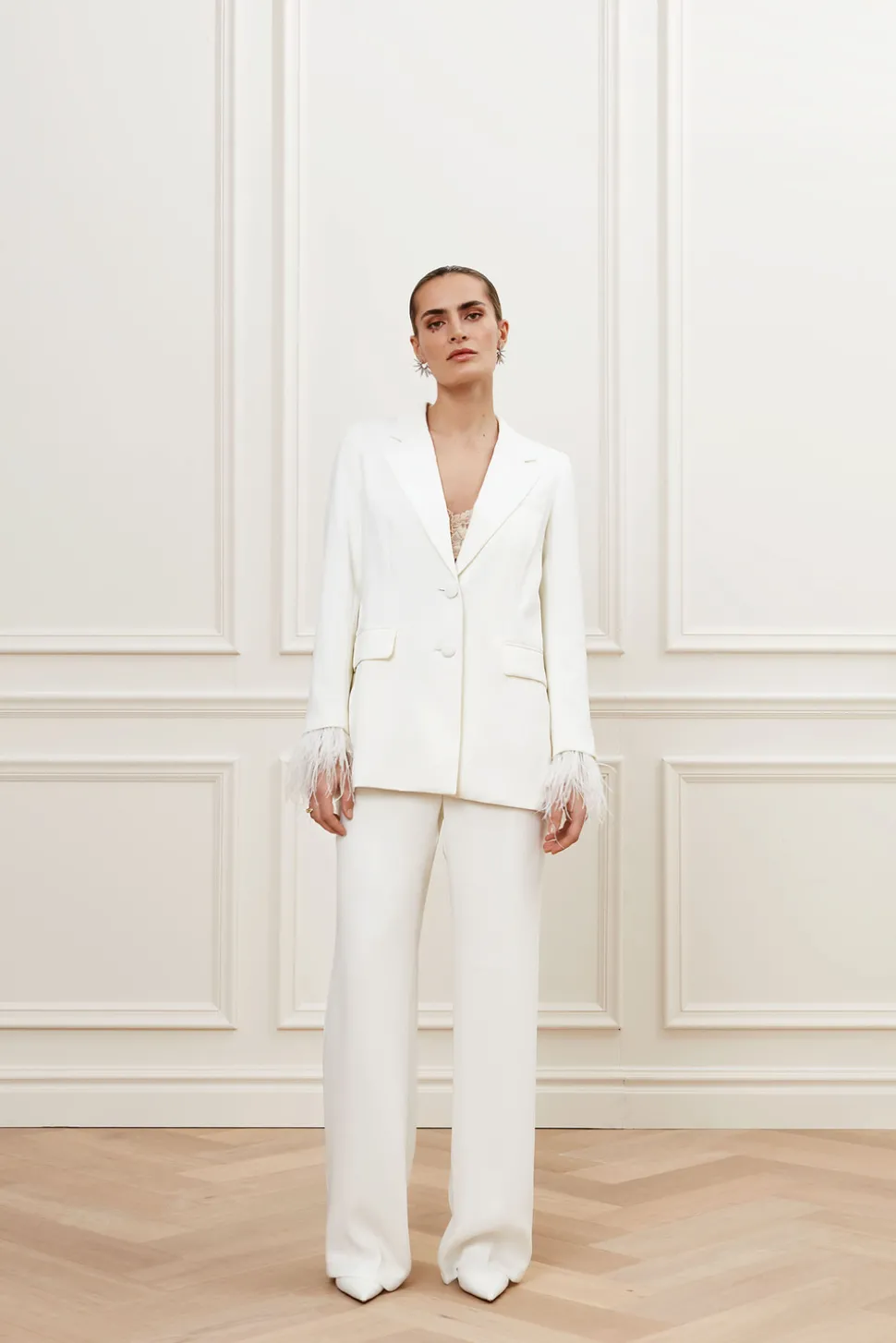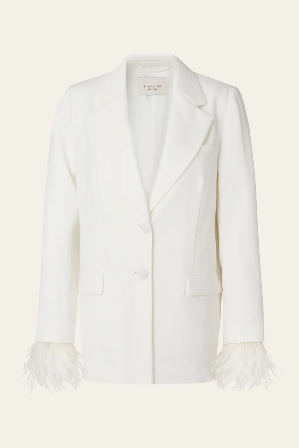 Blazer med fjäderdetaljer på ärmarna som är avtagbara. Matcha med byxor eller som cover-up till klänningen.