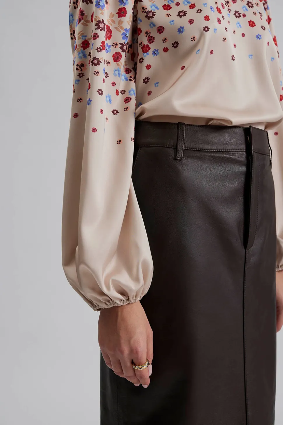 Mönstrad blus med långa ballongärmar och rundad hals.