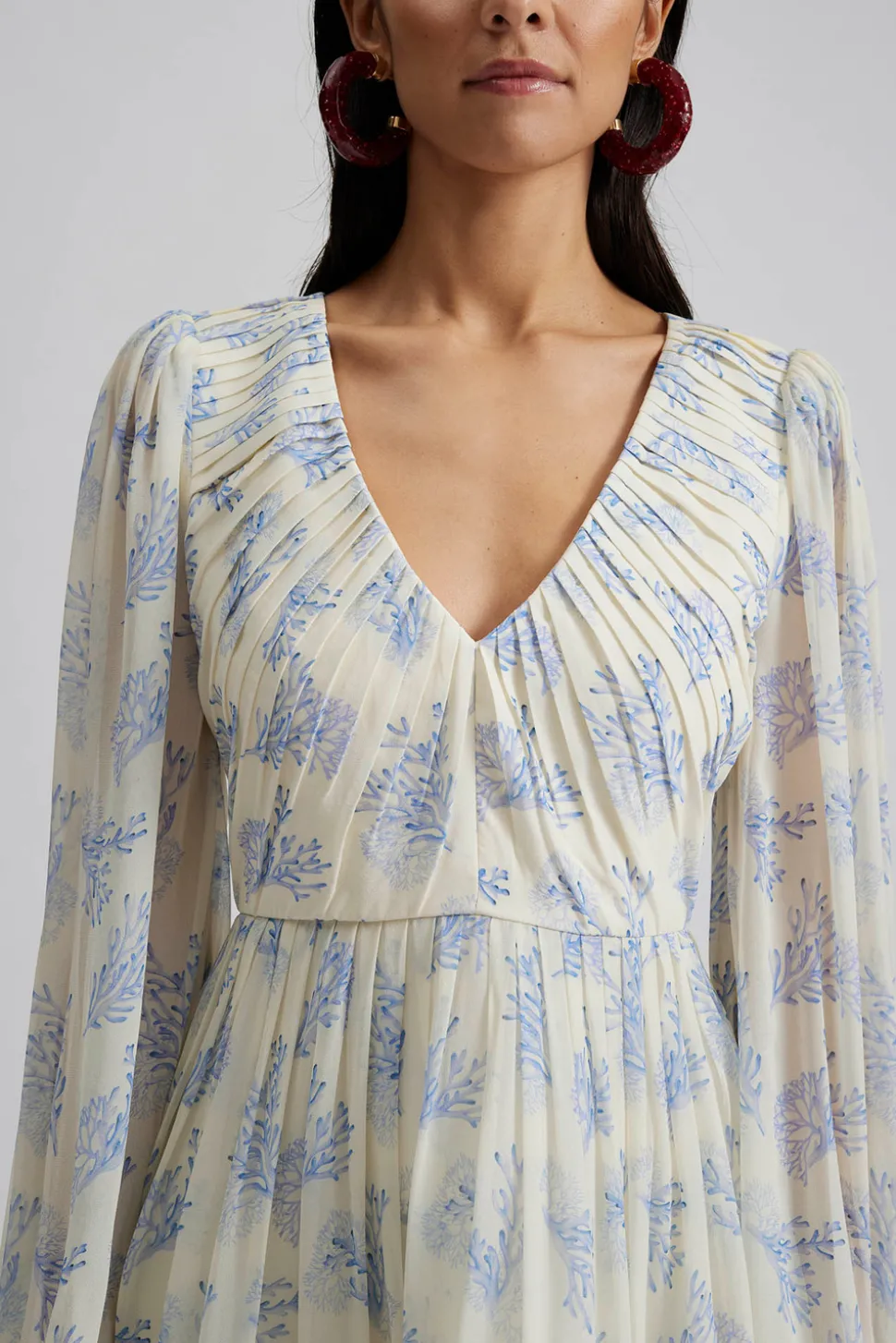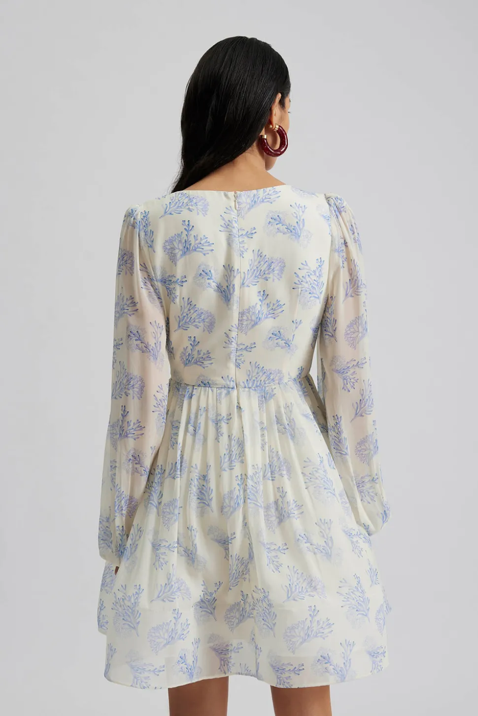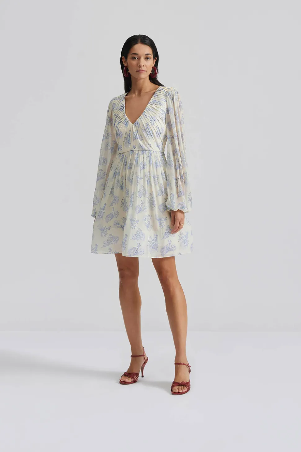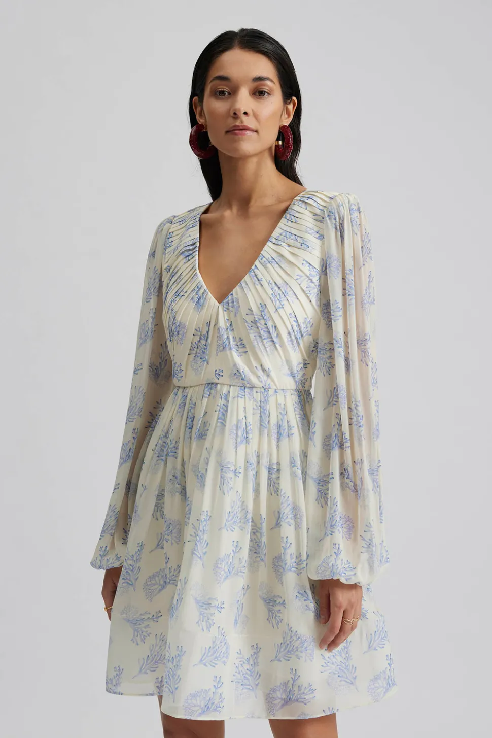 V-ringad miniklänning i chiffong med plisserade detaljer, ballongärm och en figurnära midja