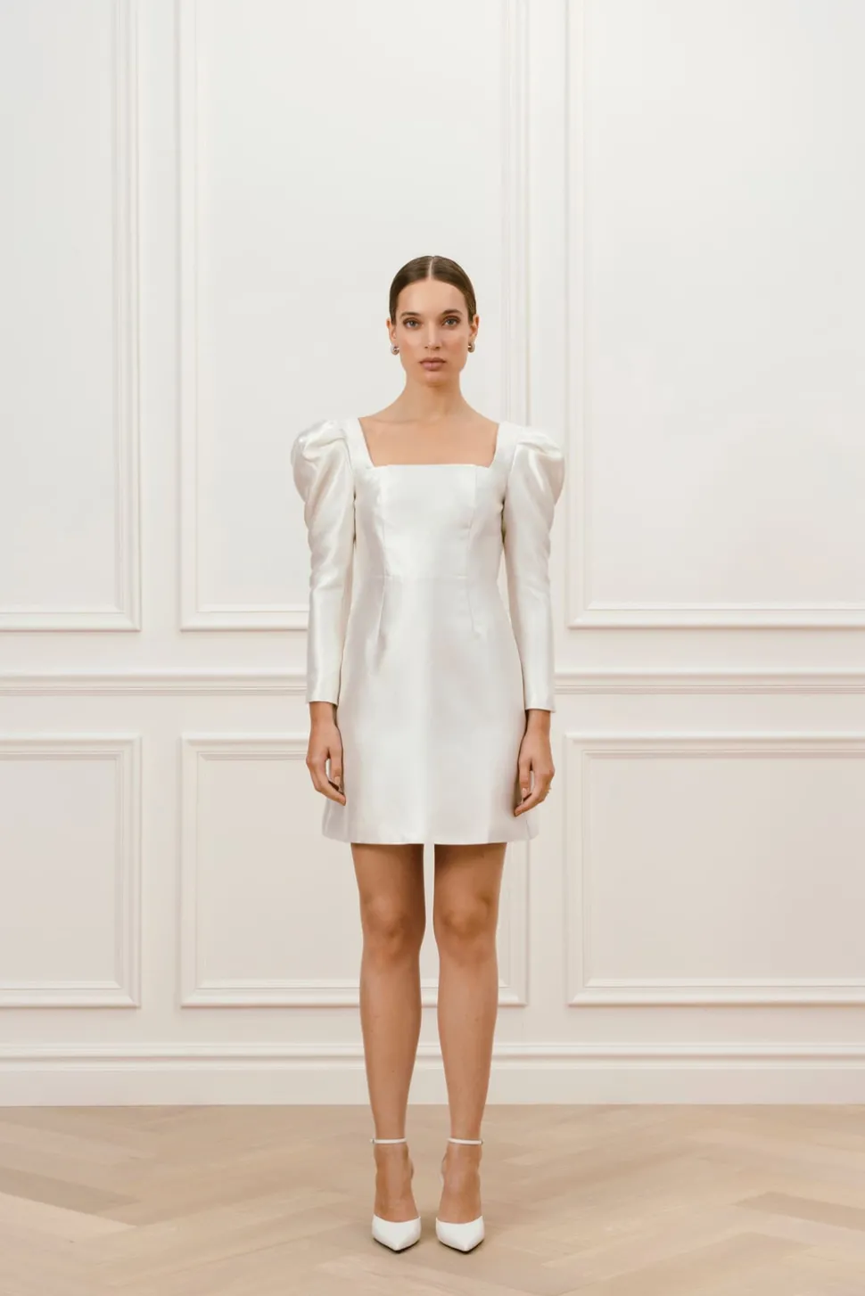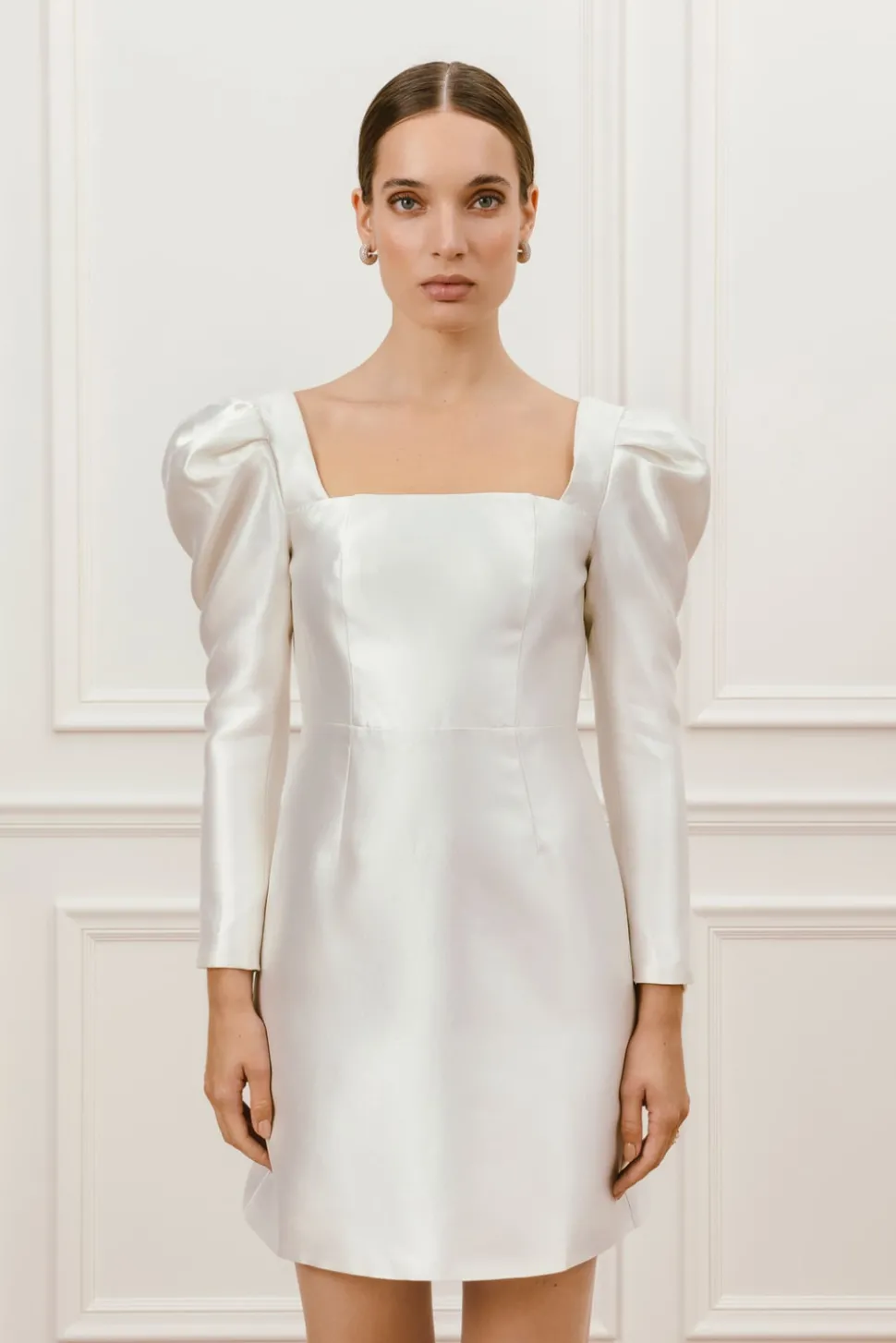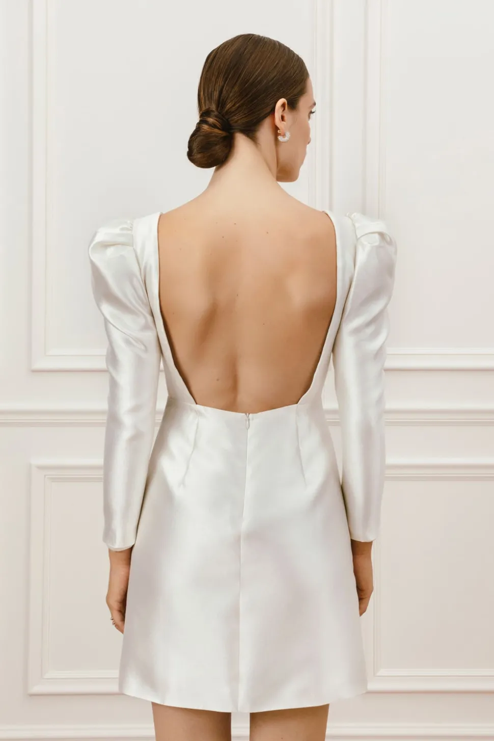 Bröllopsklänning med fyrkanting ringning och öppen rygg. Långa ärmar med puff och markerad midja för en smickrande siluett.