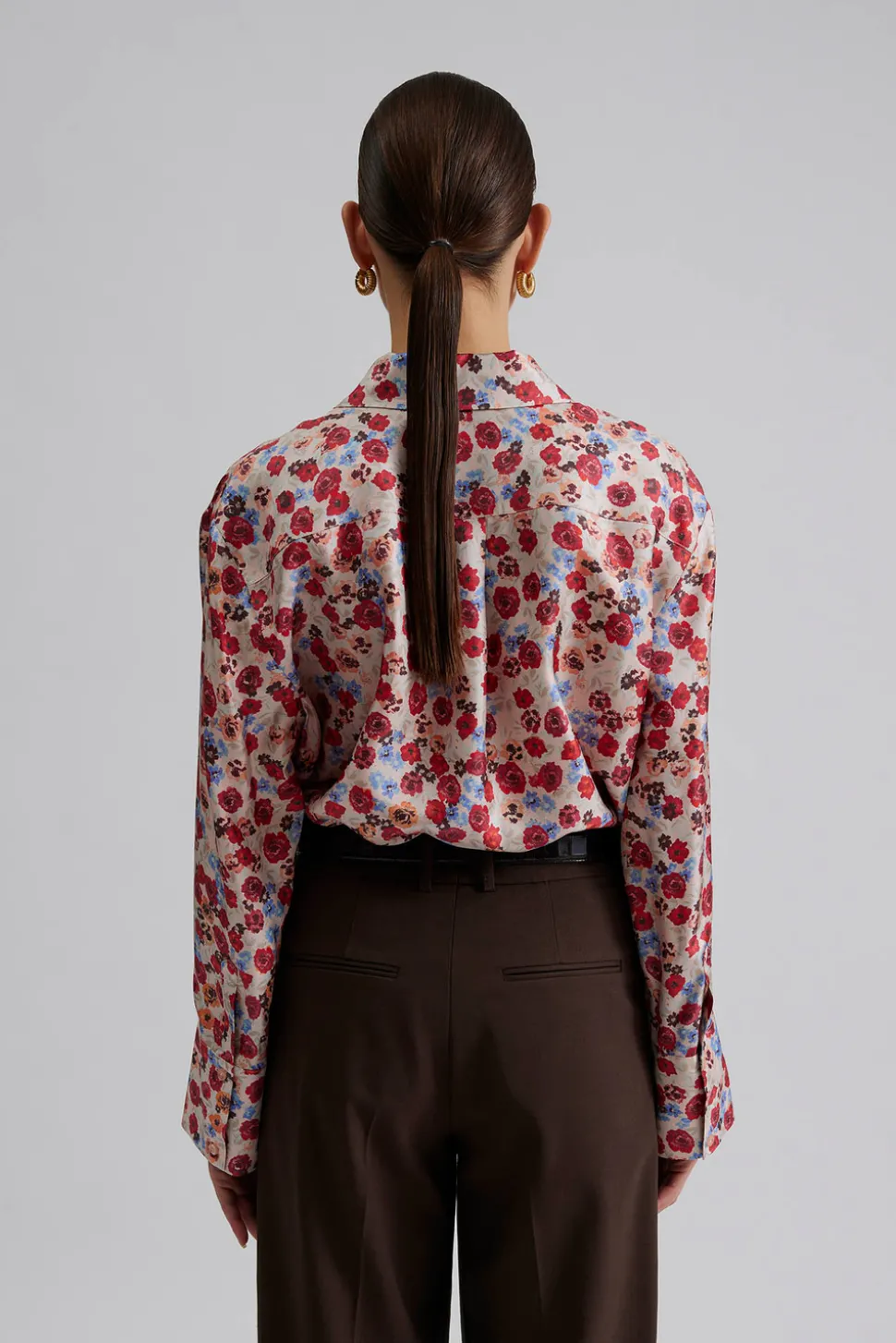 Tryckt sidenskjorta med fickdetalj, krage och knappar fram.