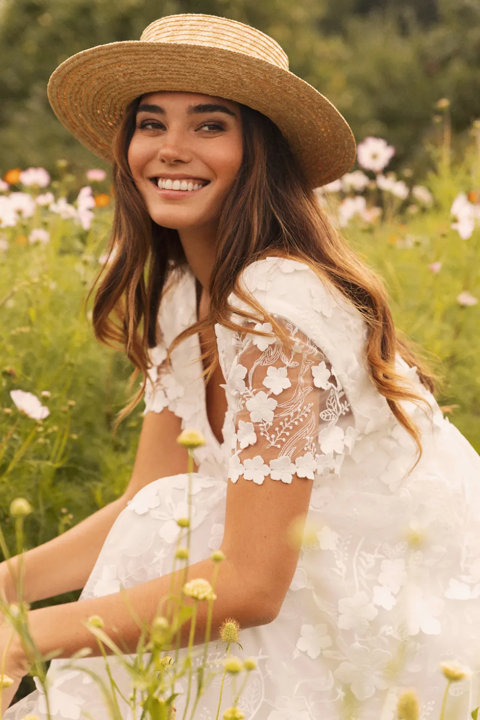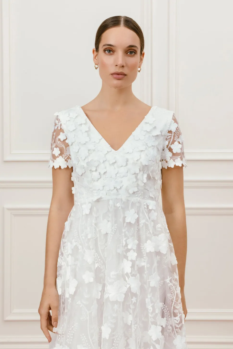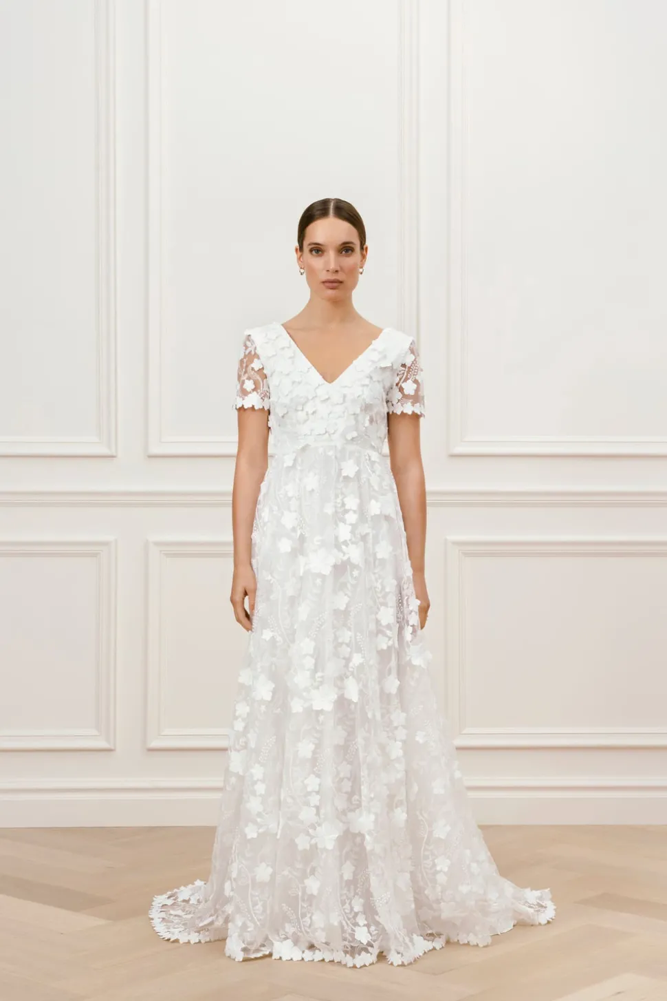Bröllopsklänning med A-linjeformad tyllkjol dekorerad med 3D-blommor, V-ringning och korta ärmar. Klänningen har en djupt öppen rygg och kanterna på klänningen är dekorerade med fina blommor.