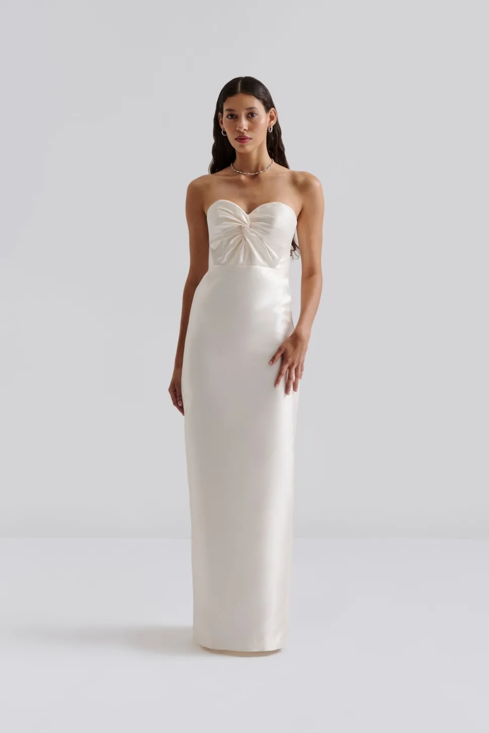 Bandeau-brudklänning i ett glänsande material med slits i ryggen.