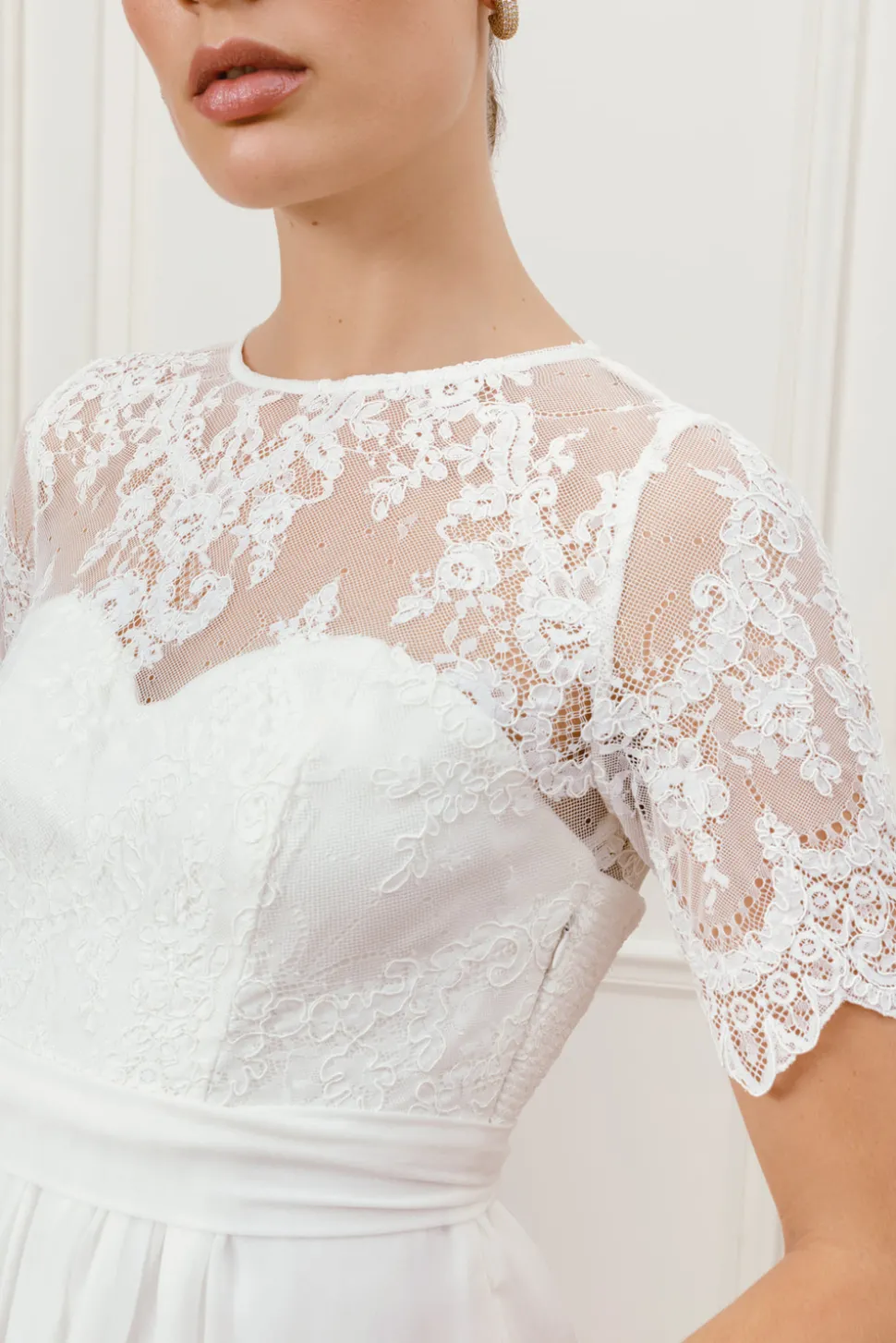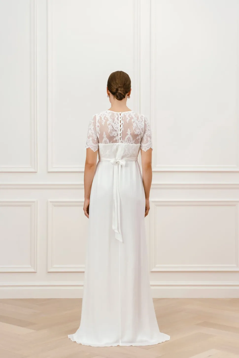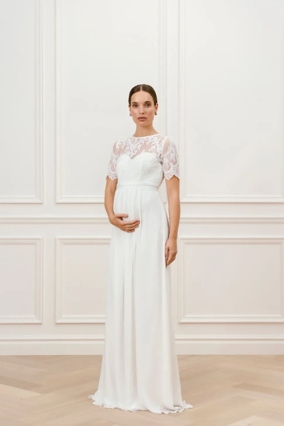 Bröllopsklänning för gravida med topp i spets och en kjol i chiffong, den har ett bälte att knyta ovanför magen.