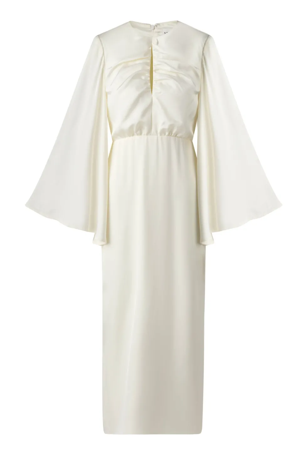 Satinbrudklänning i midilängd med långa vida ärmar och cut-out detalj över bröstet.