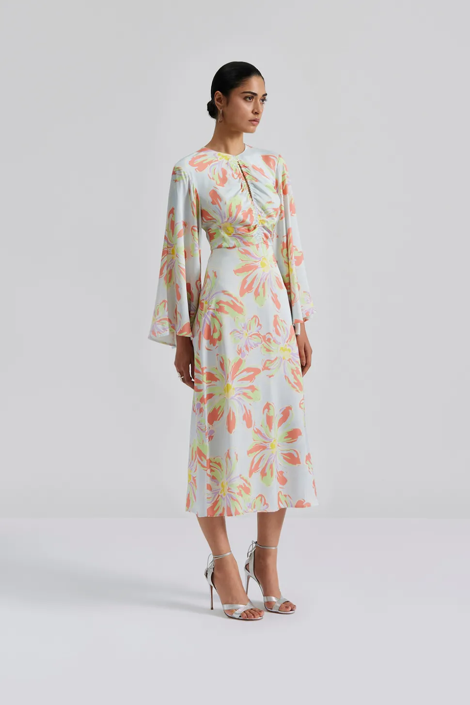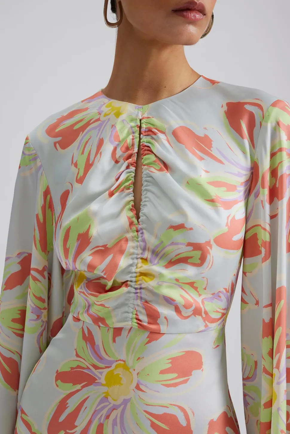 Mönstrad midiklänning med lång ärm och rynkad detalj framtill.