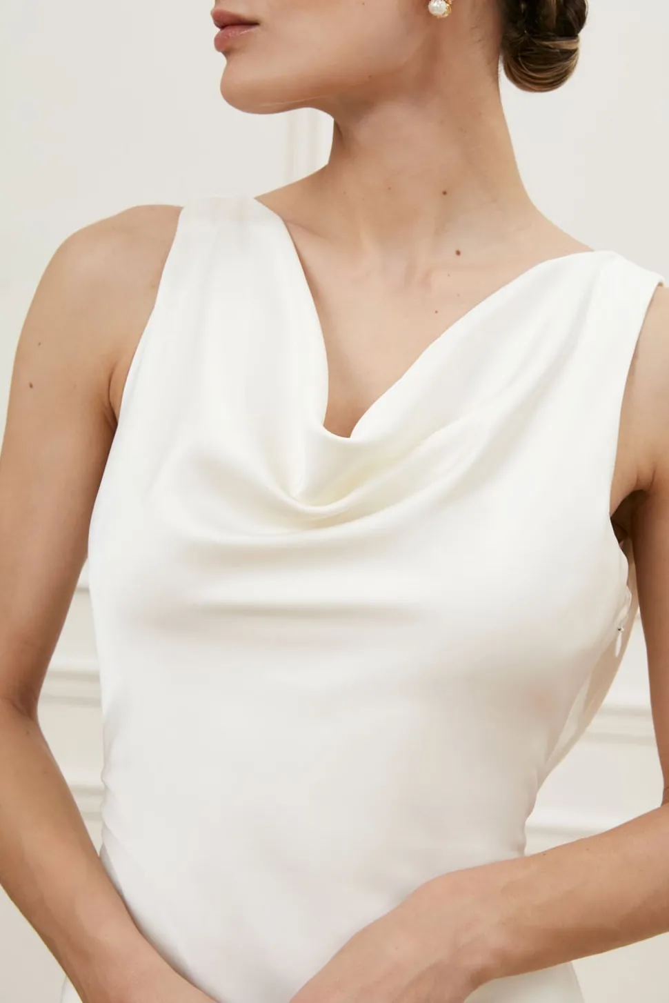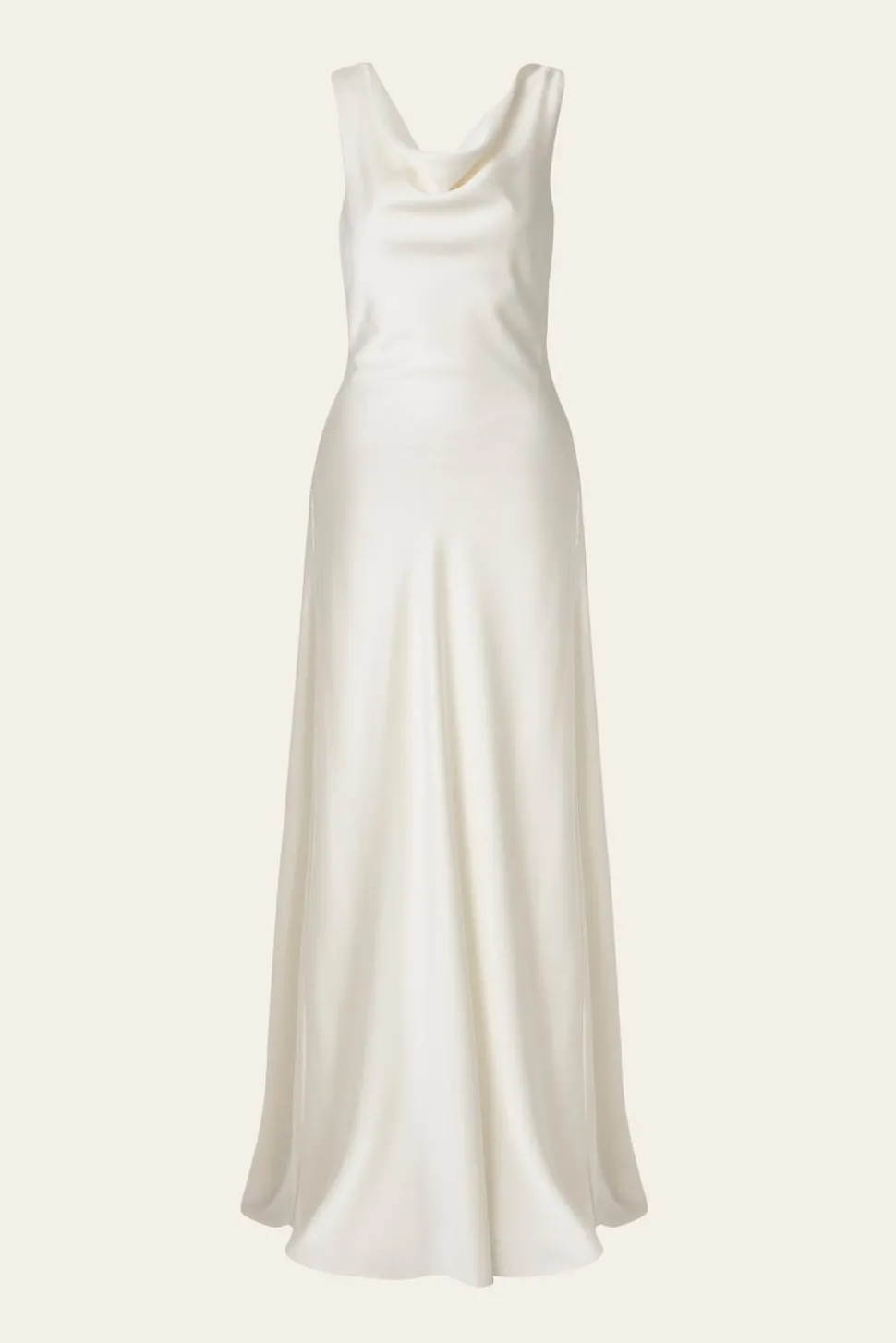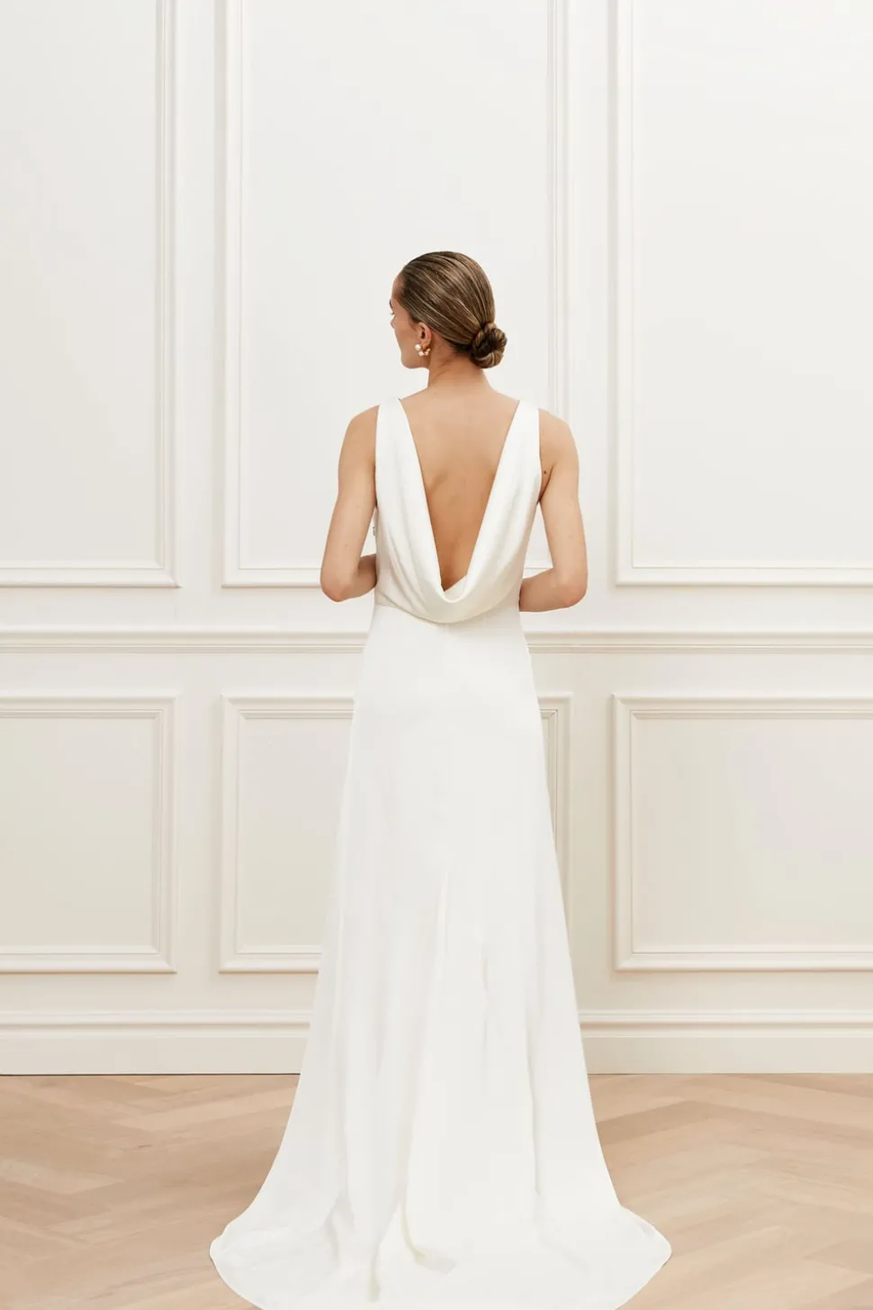 A-linjeformad bröllopsklänning i satin med draperad halsringning både fram och bak.