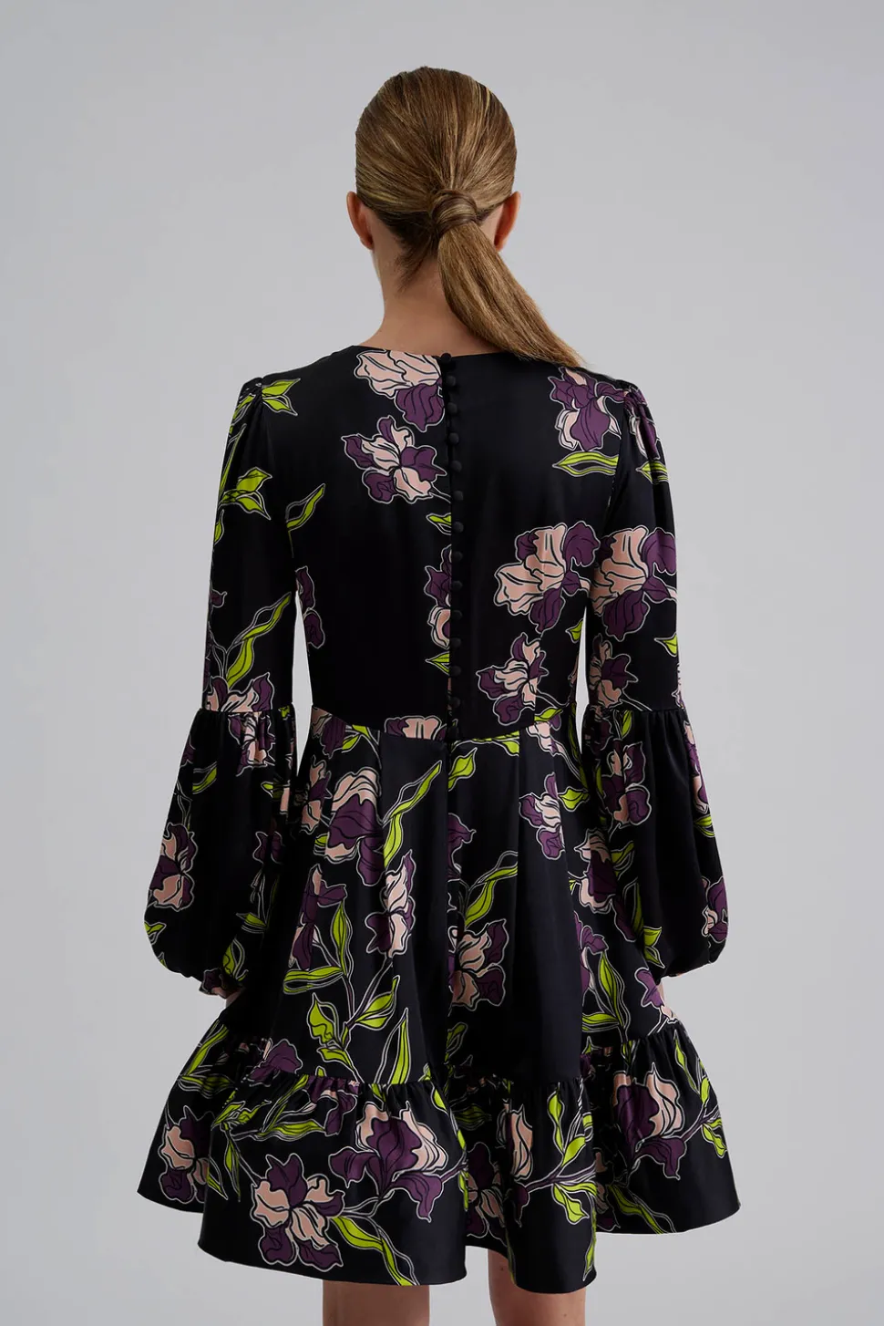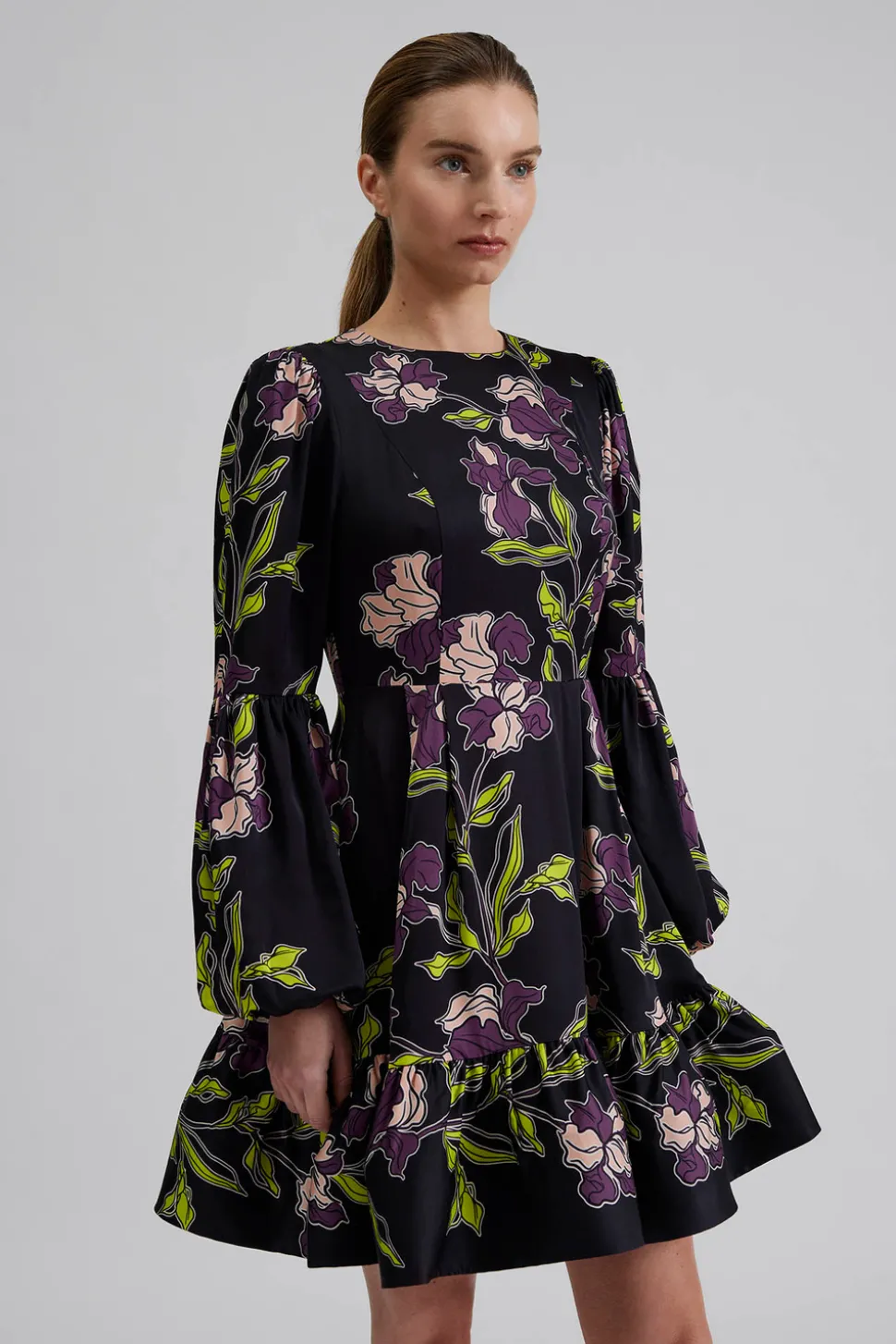 Miniklänning med långa ballongärmar och volangdetaljer.