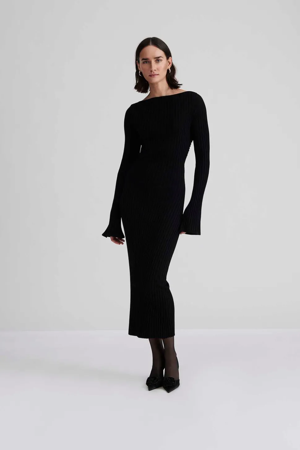 Ribbstickad figurnära midiklänning med cut out detalj och öppen rygg. Klänningen har en figurnära passform och ärmarna är lätt utsvängda.