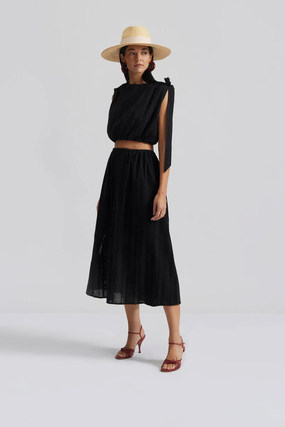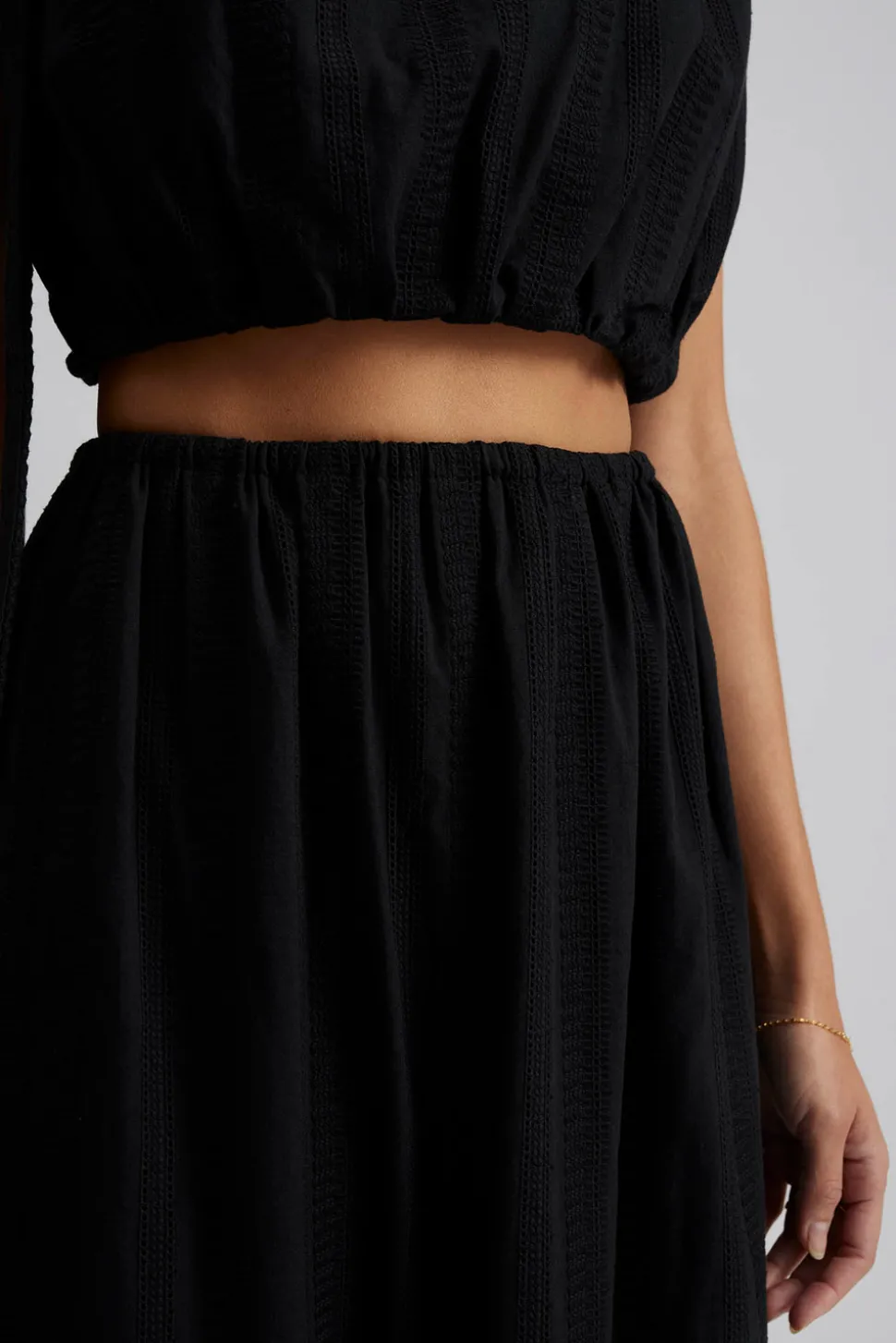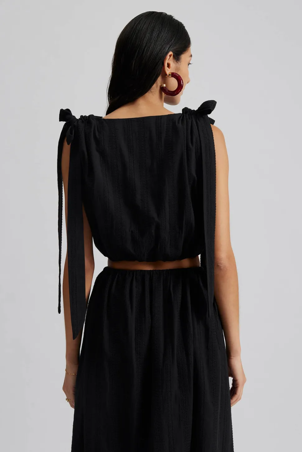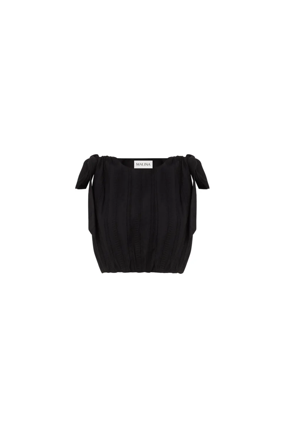 Broderad croppad topp med rynk- och snörningsdetaljer på axlarna.