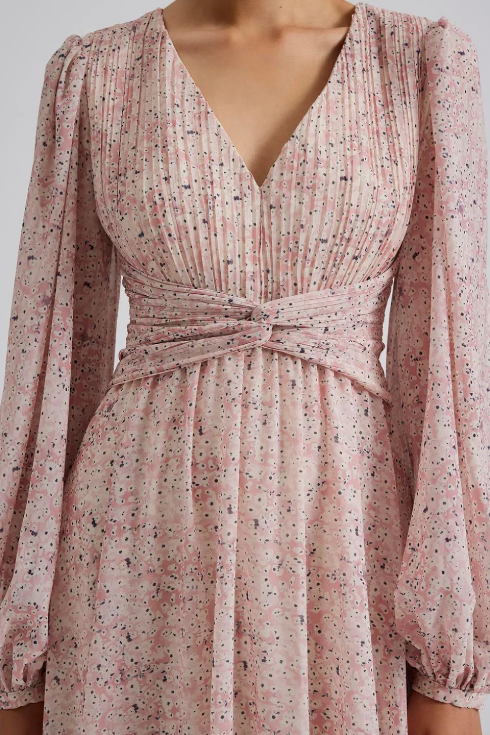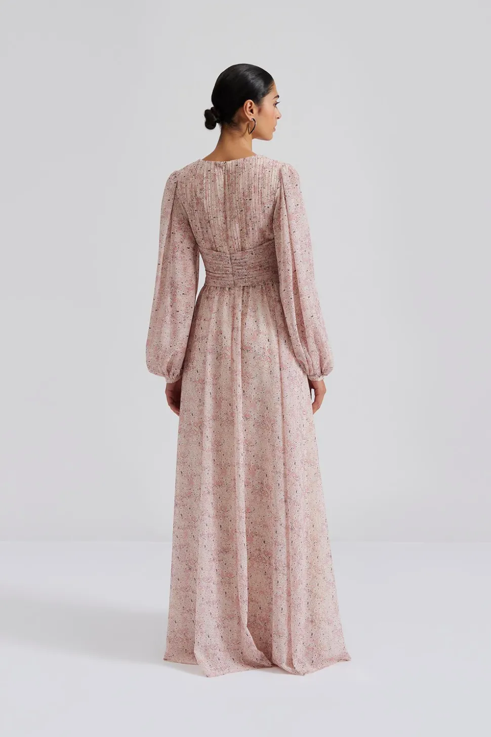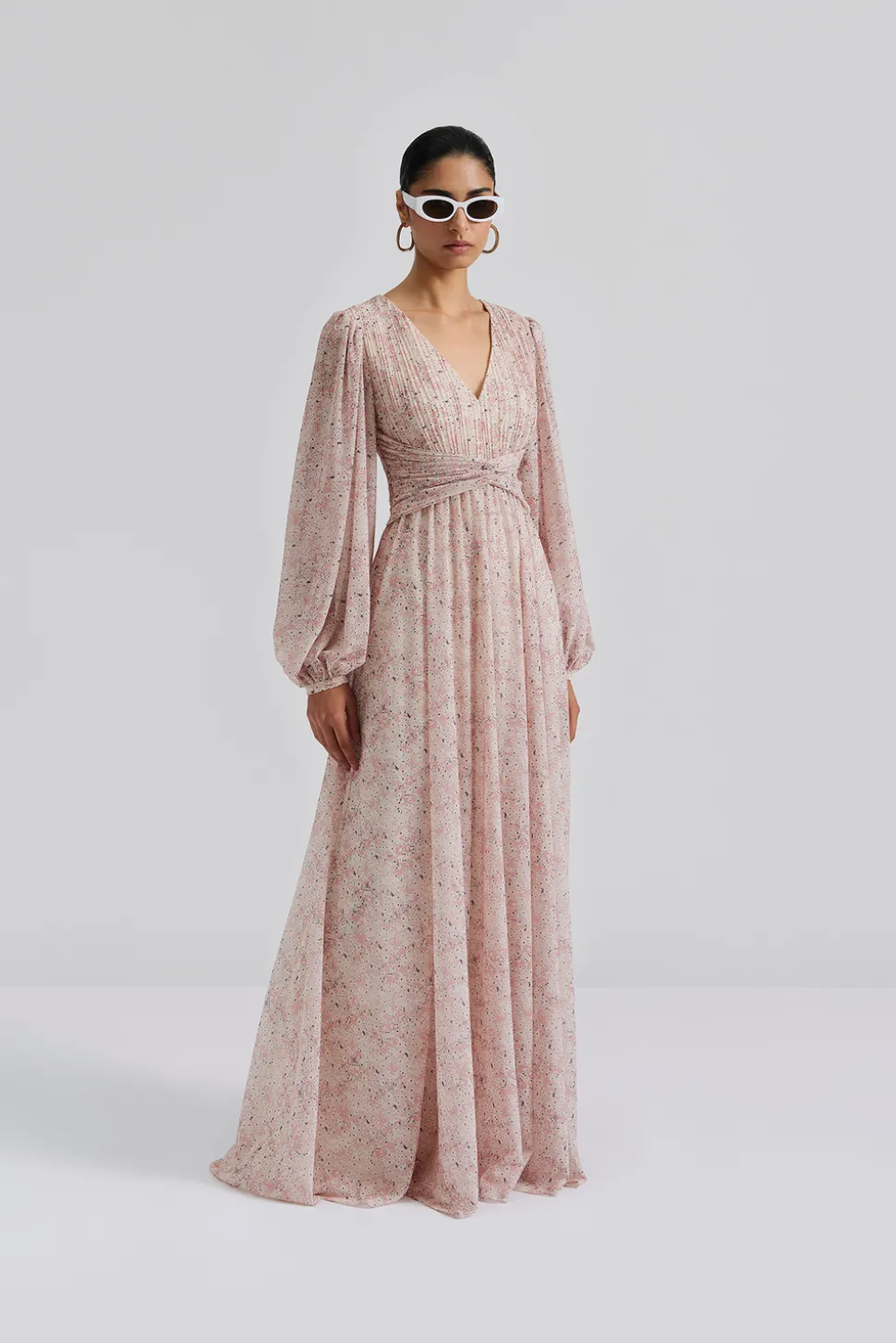 Blommig maxiklänning med v-ringning, ballongärm och detaljerad midja.