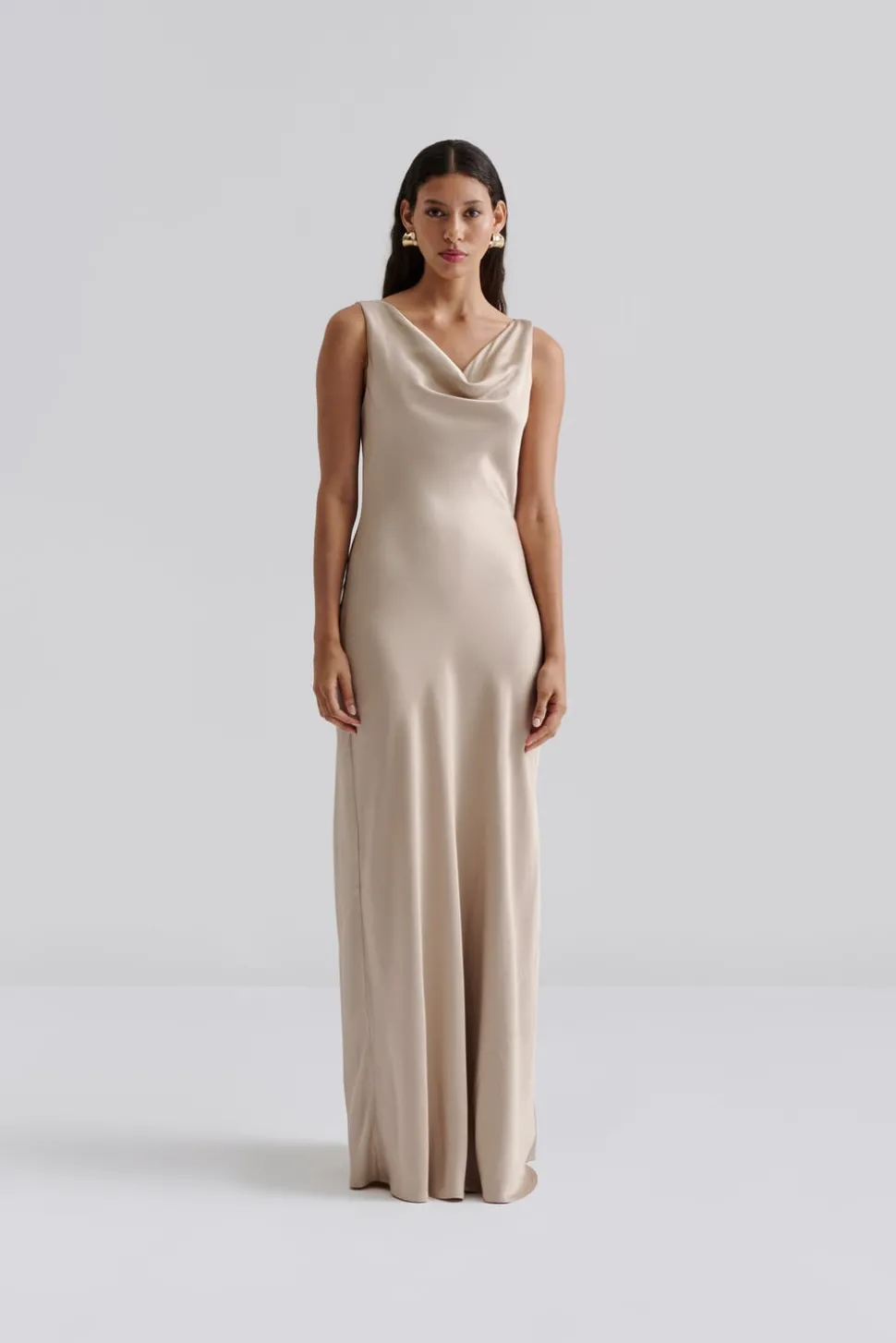 Ärmlös maxiklänning i satin med en draperad halsringning.