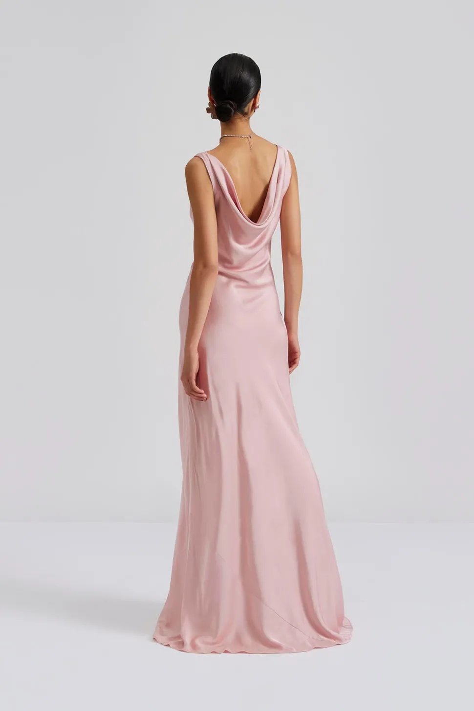 Ärmlös maxiklänning i satin med en draperad halsringning.