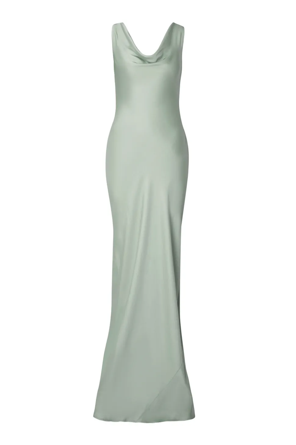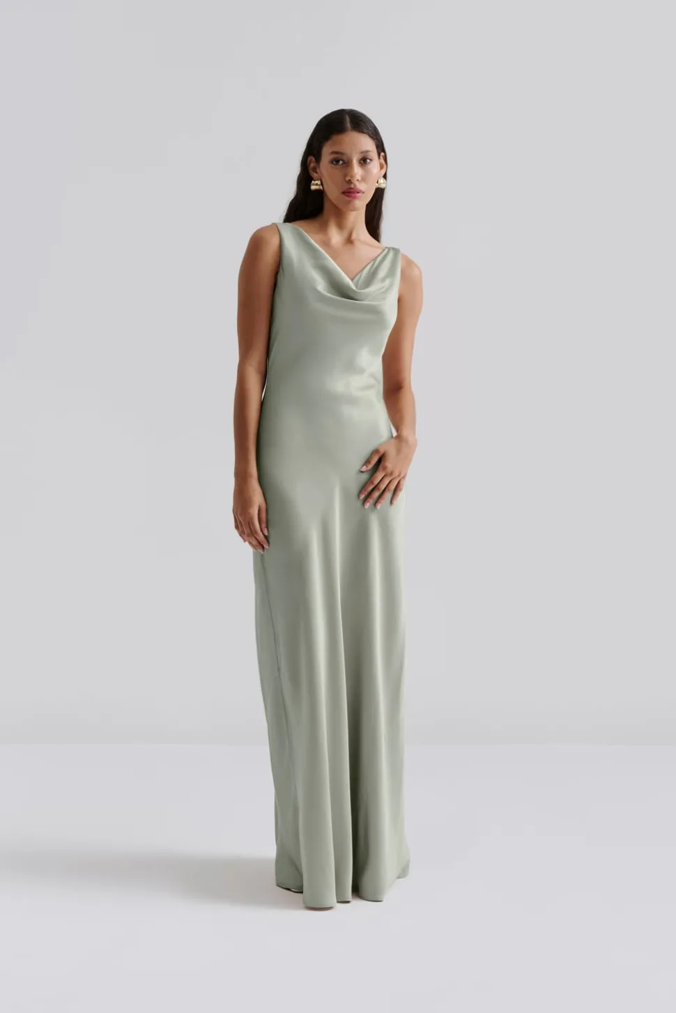 Ärmlös maxiklänning i satin med en draperad halsringning.