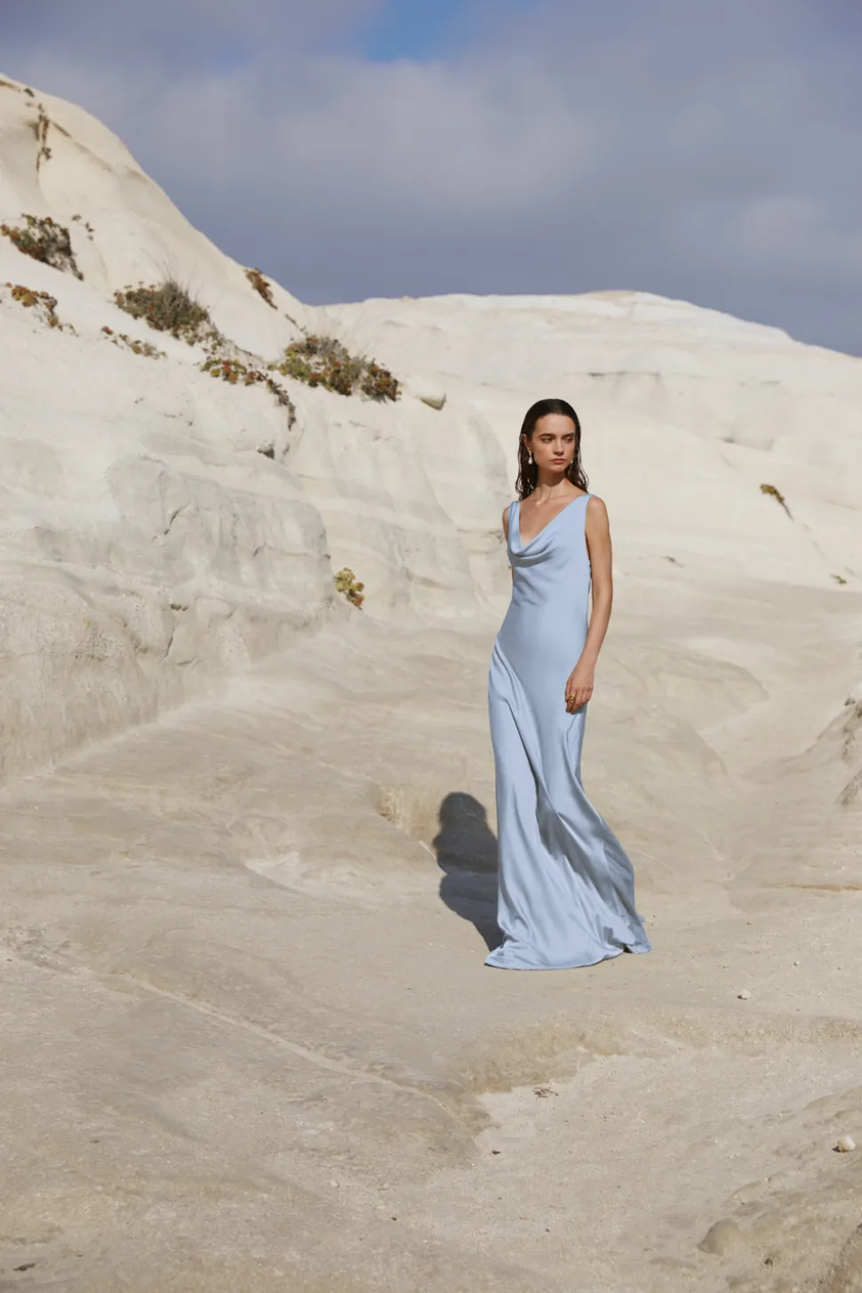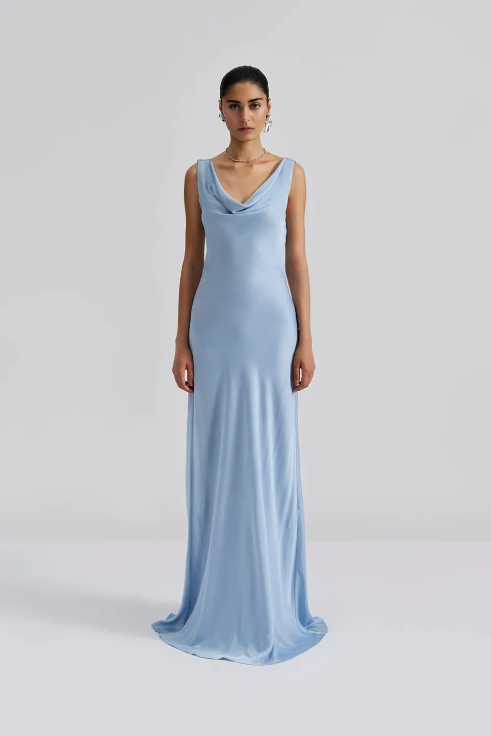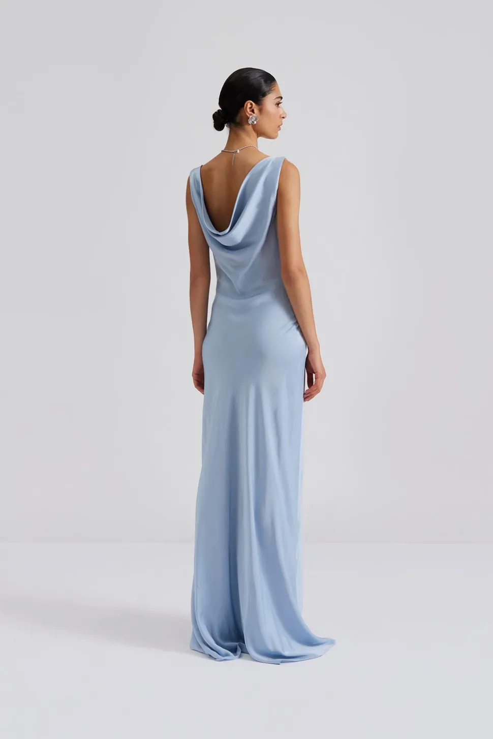 Ärmlös maxiklänning i satin med en draperad halsringning.