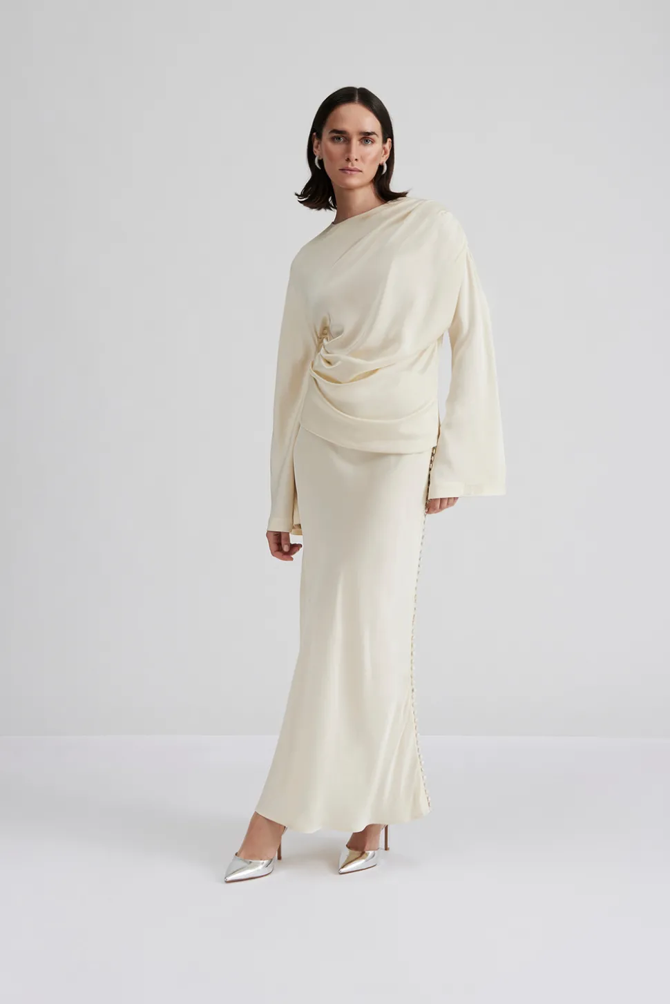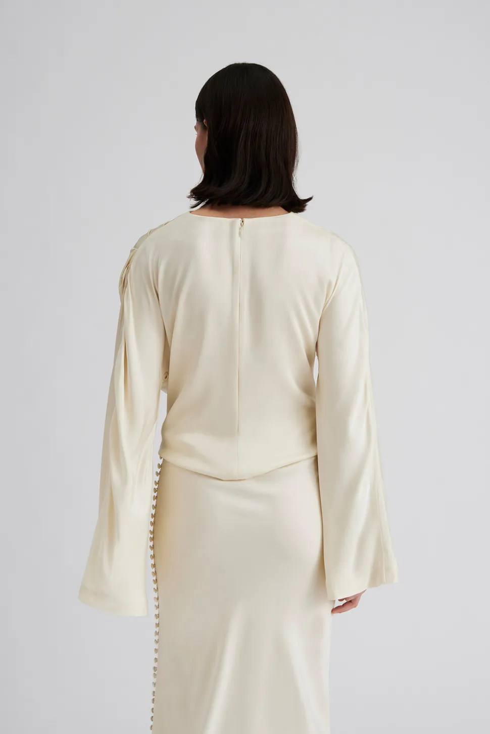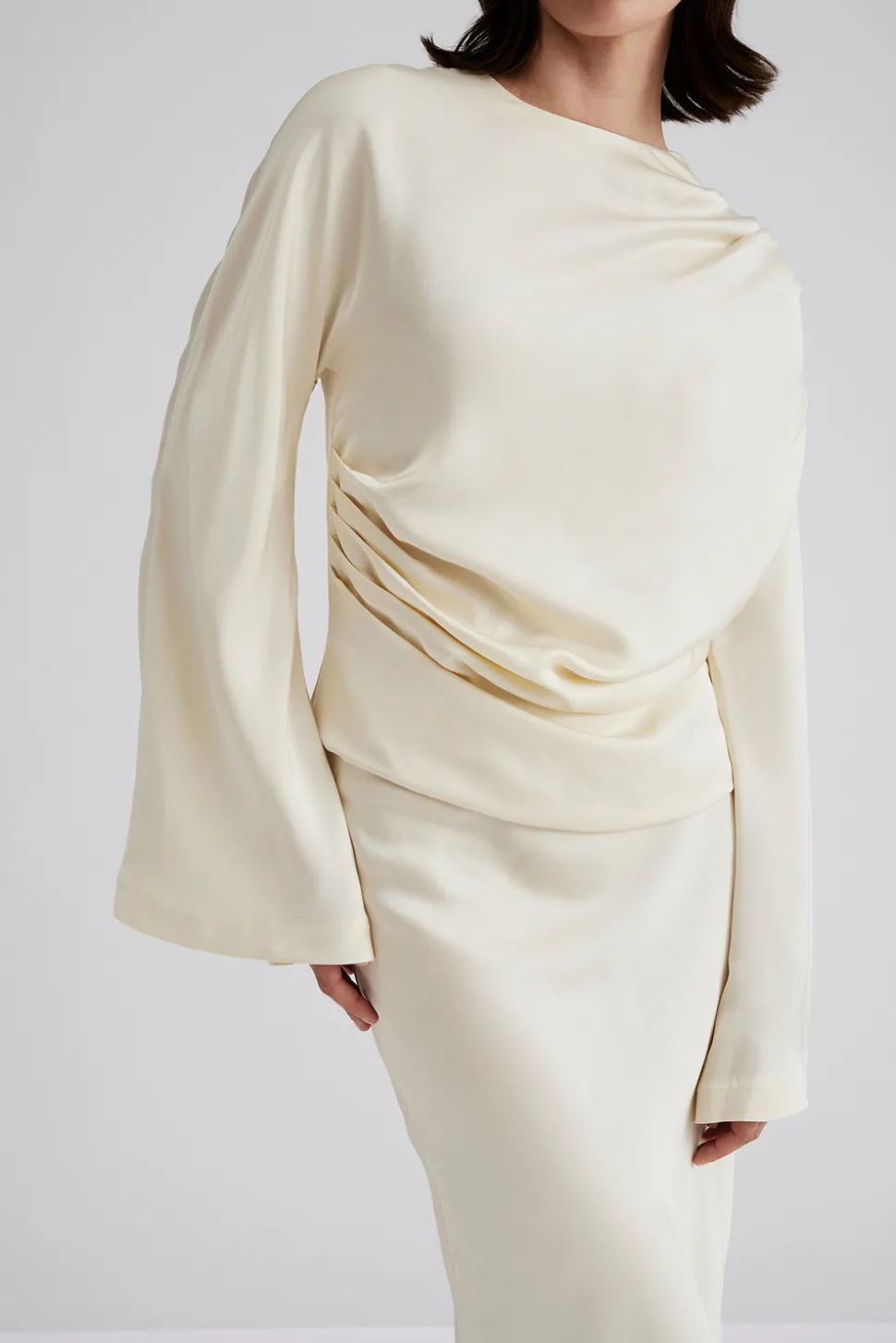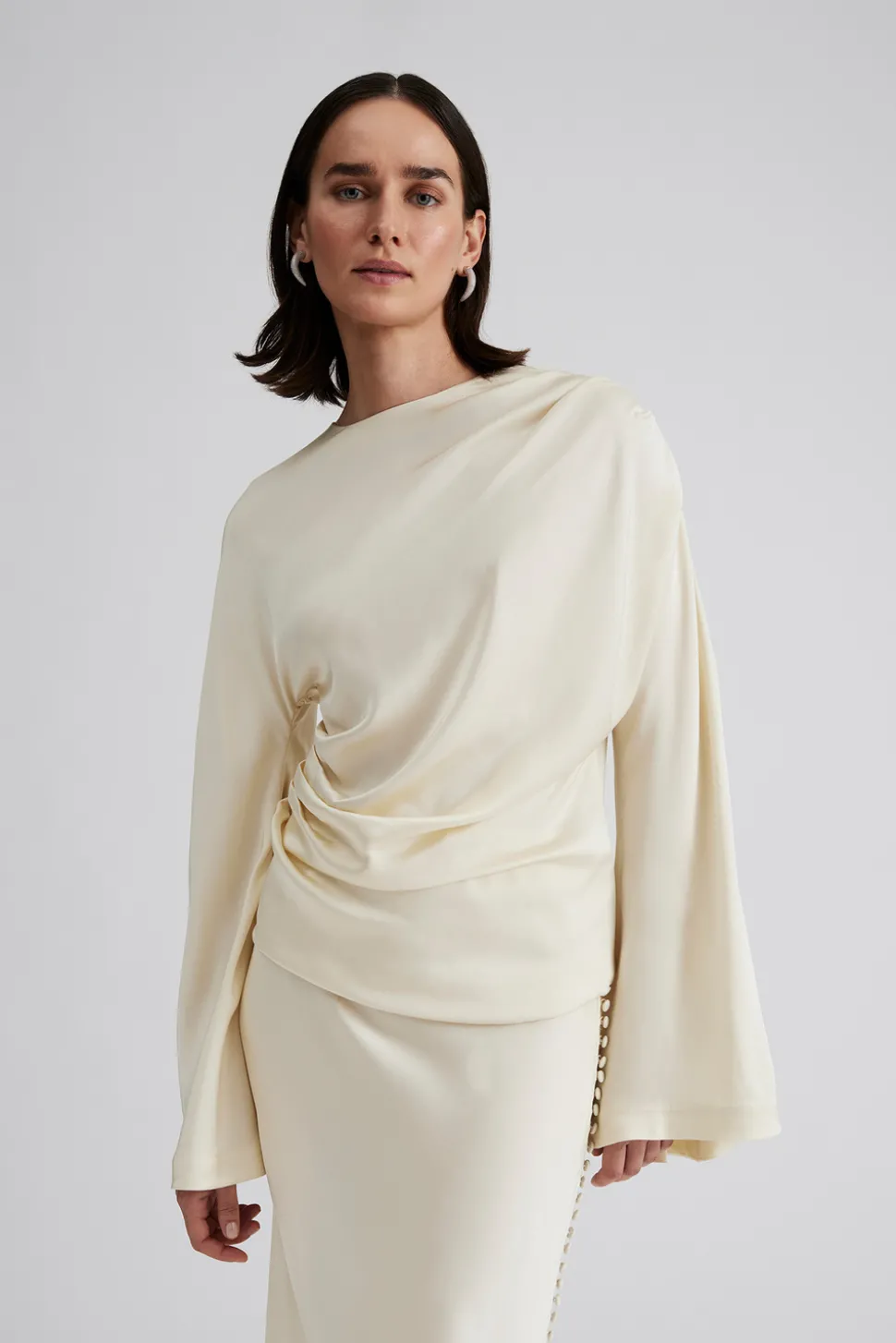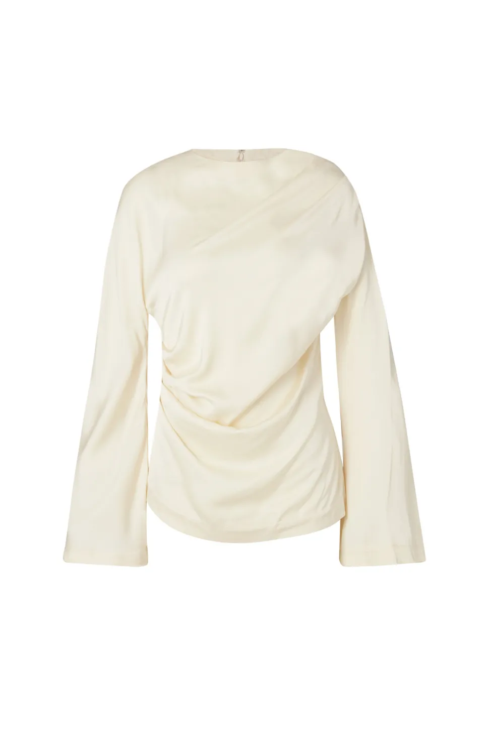 Draperad blus med långa vida ärmar.