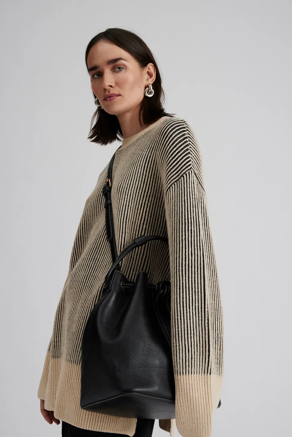Väska i 100% läder med söm detaljer och justerbara band.