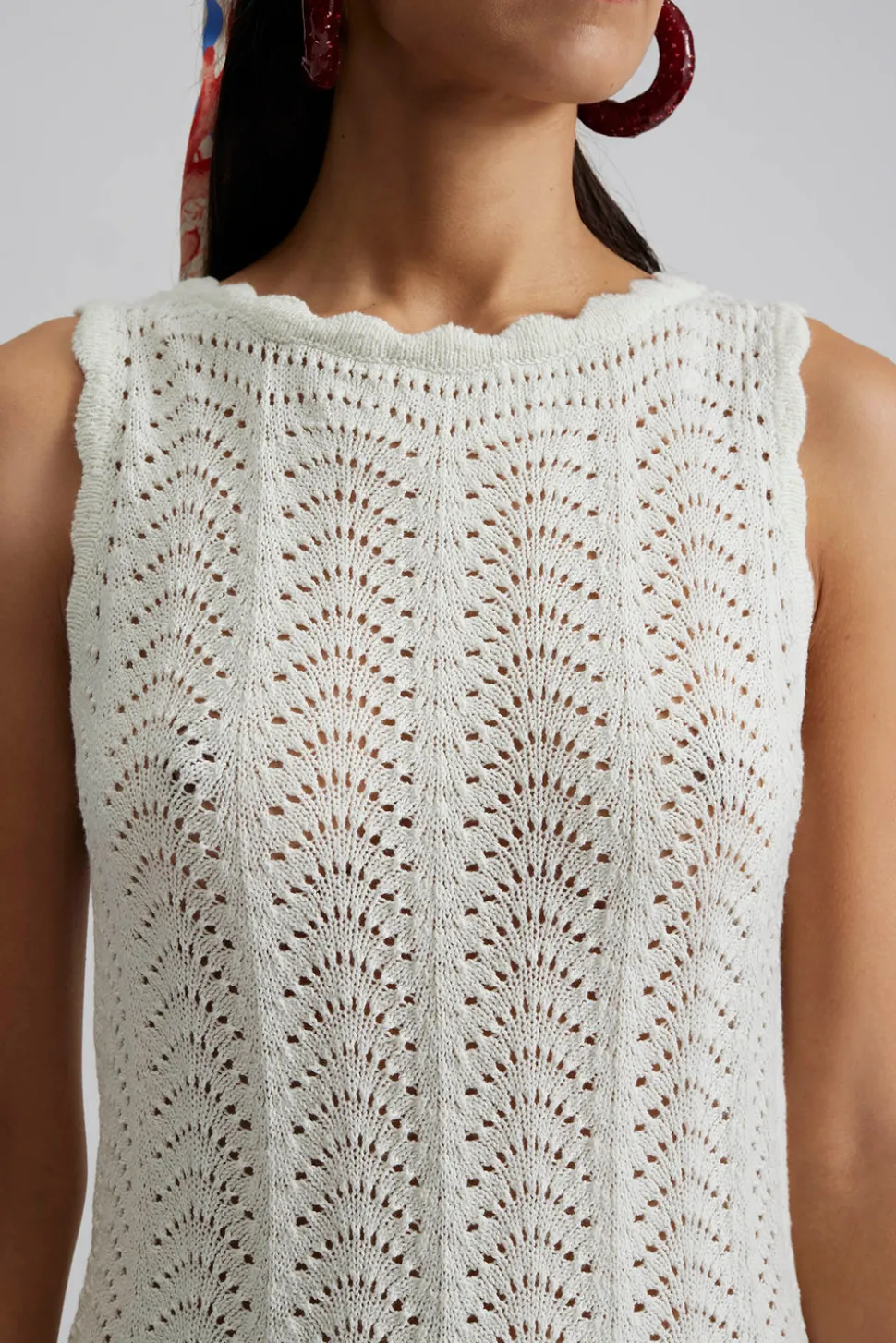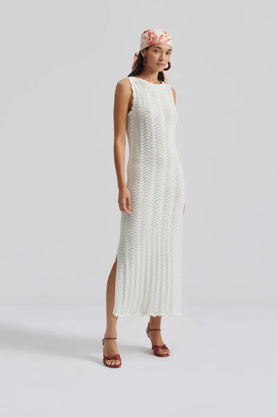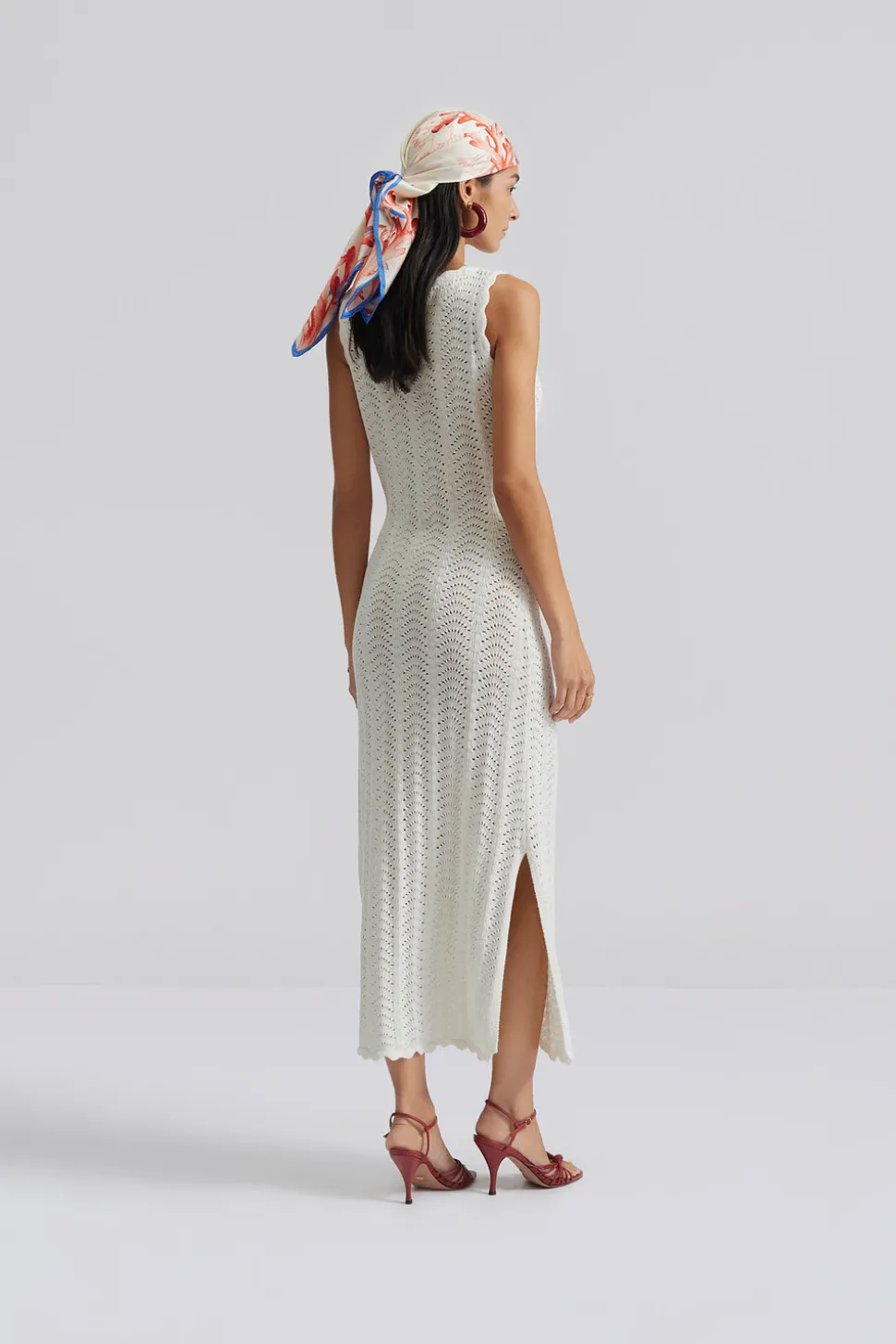 Stickad midiklänning med vågig kant och slits.