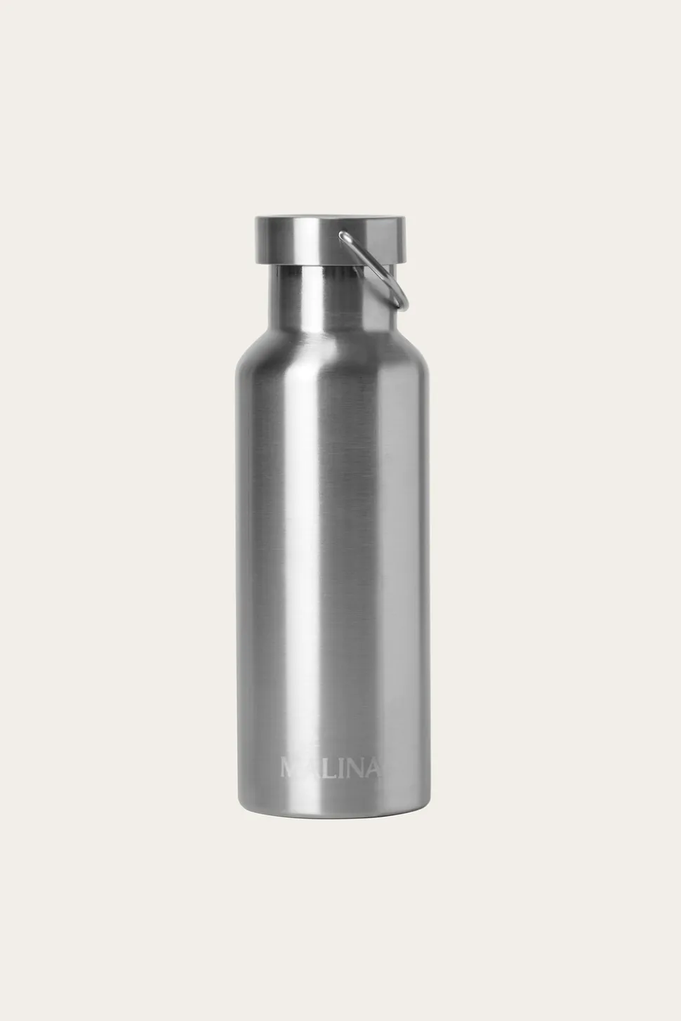 The Malina Water Bottle is a 500 ml stainless steel thermal bottle, keeping its contents cold/warm longer than the average water bottle. It features engraved Malina logotype on the top and side of the bottle