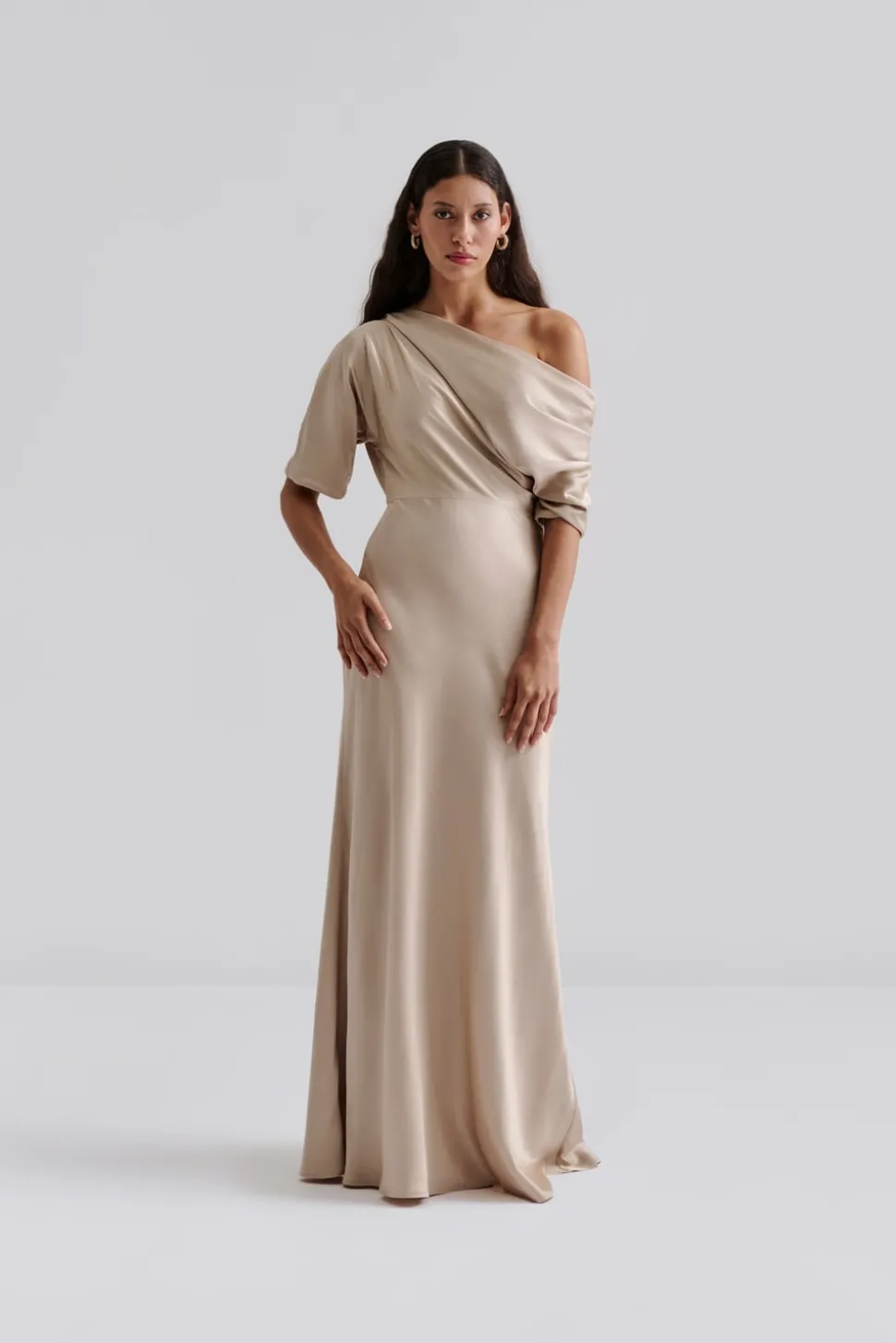 Maxiklänning i satin med asymmetrisk halsringning, kort ärm och draperade detaljer.