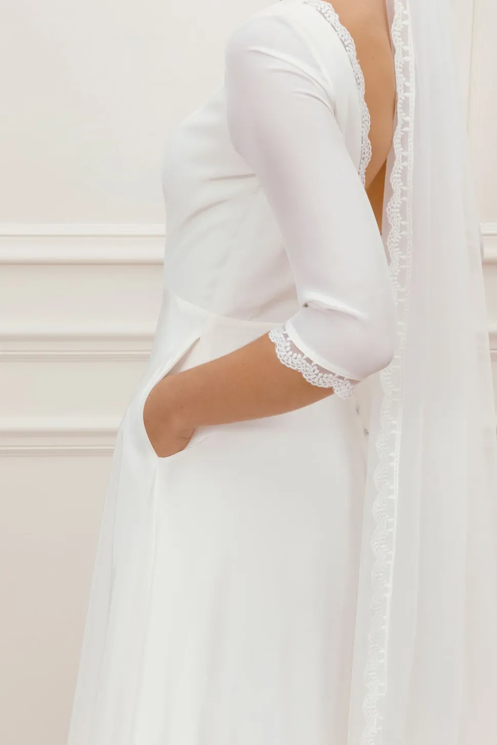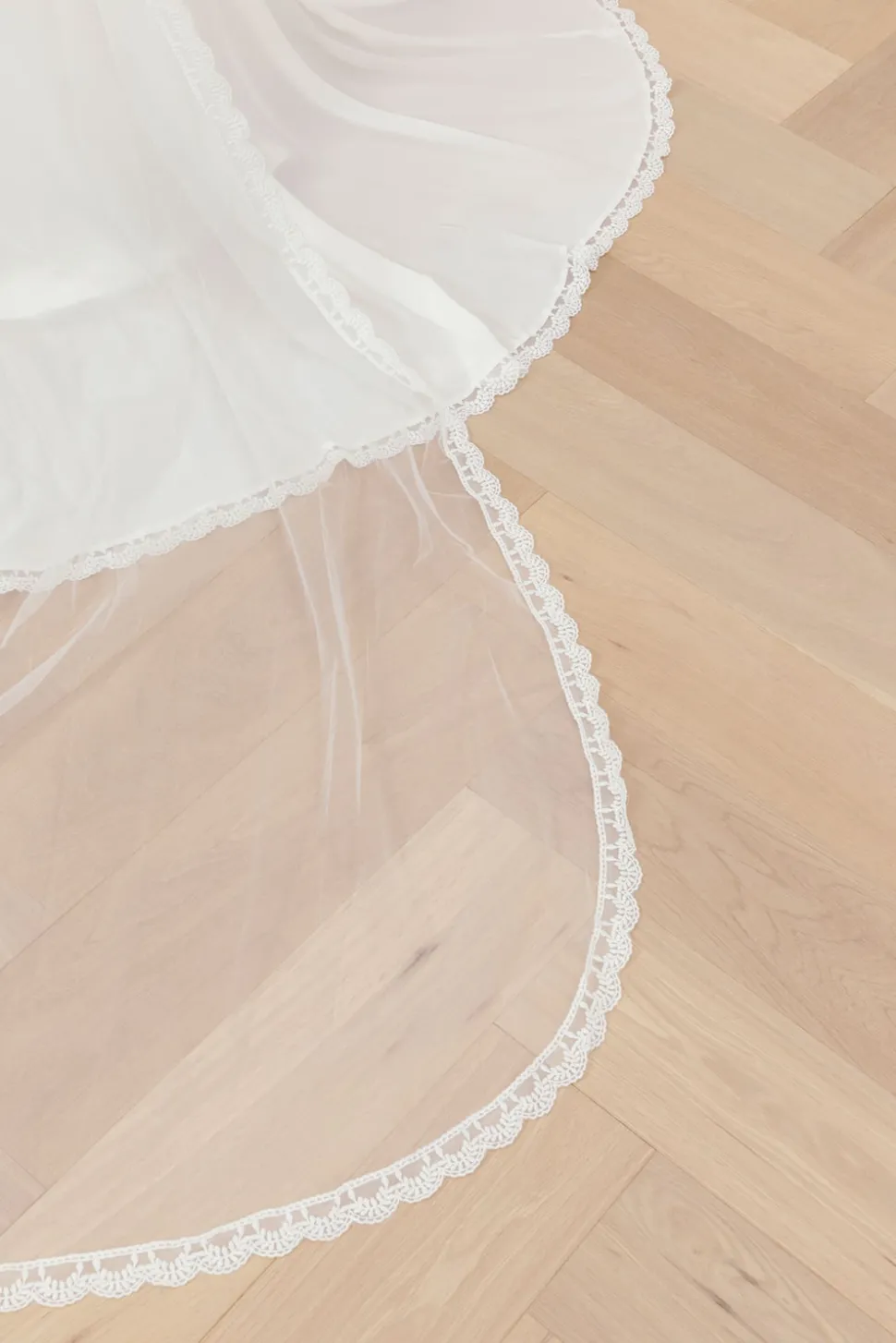 Lång slöja dekorerad med samma spets som på vår Meghan-klänning.