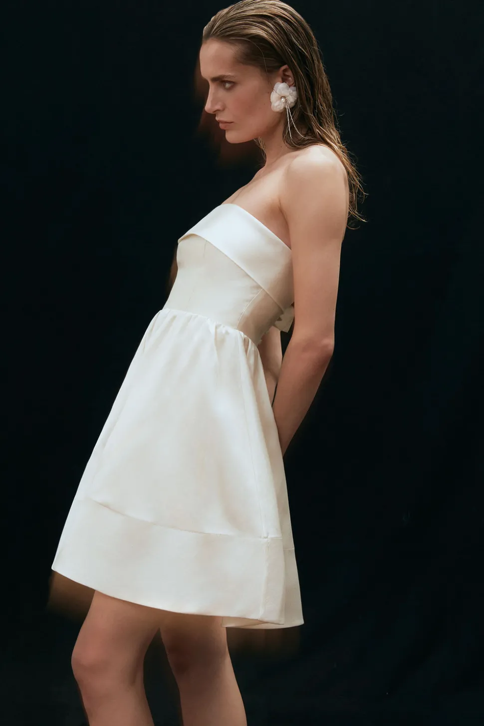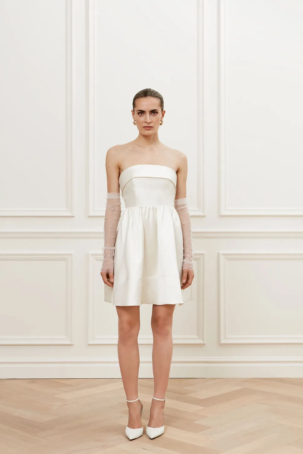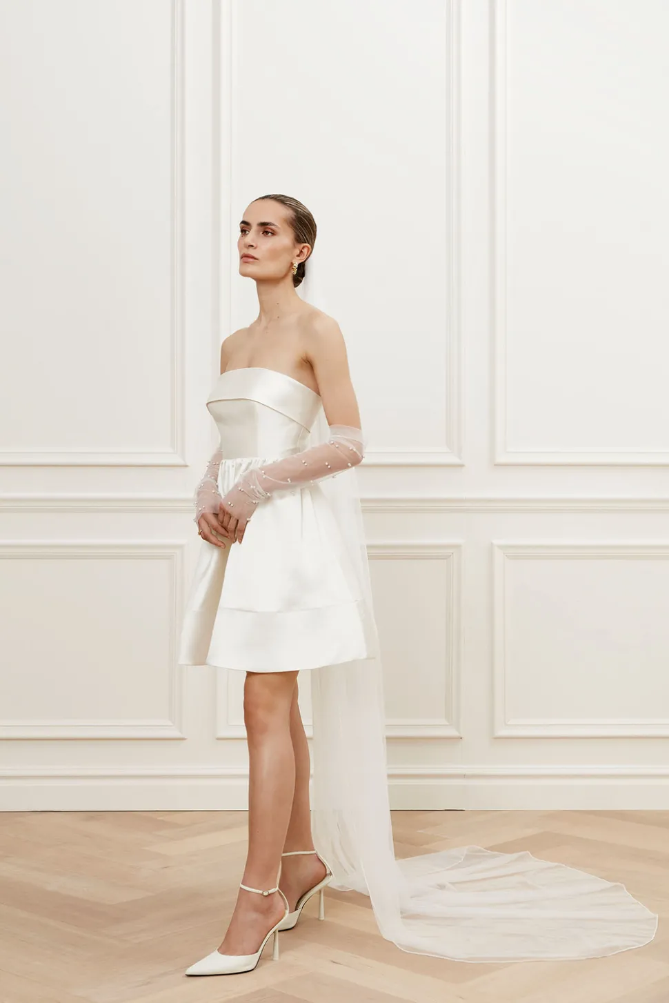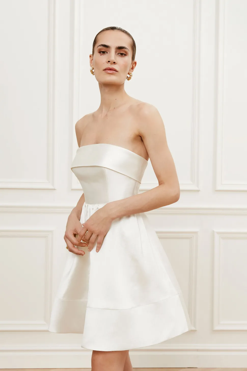Kort bröllopsklänning i skimrande material med definierad midja.