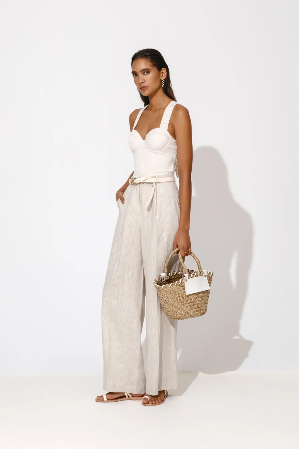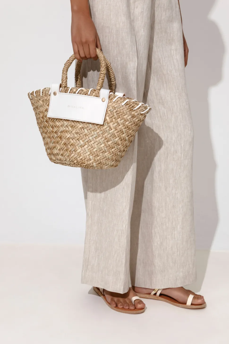 Stråväska med skinndetaljer och justerbara band som är avtagbara.