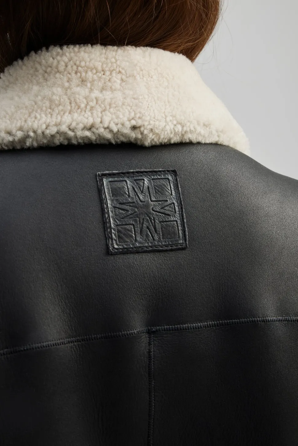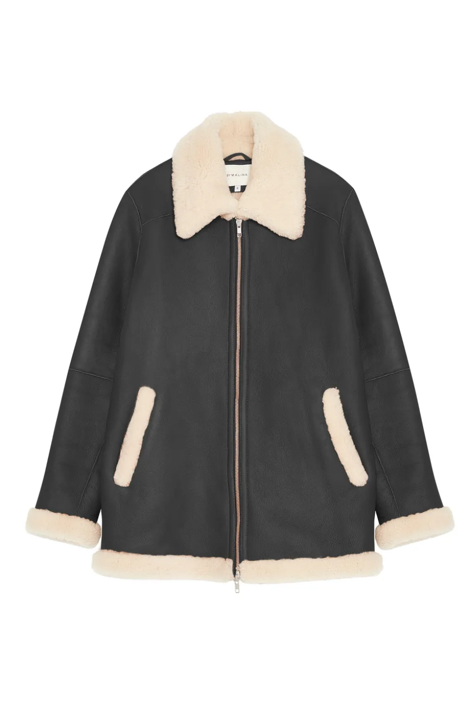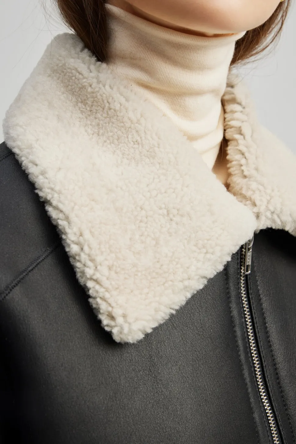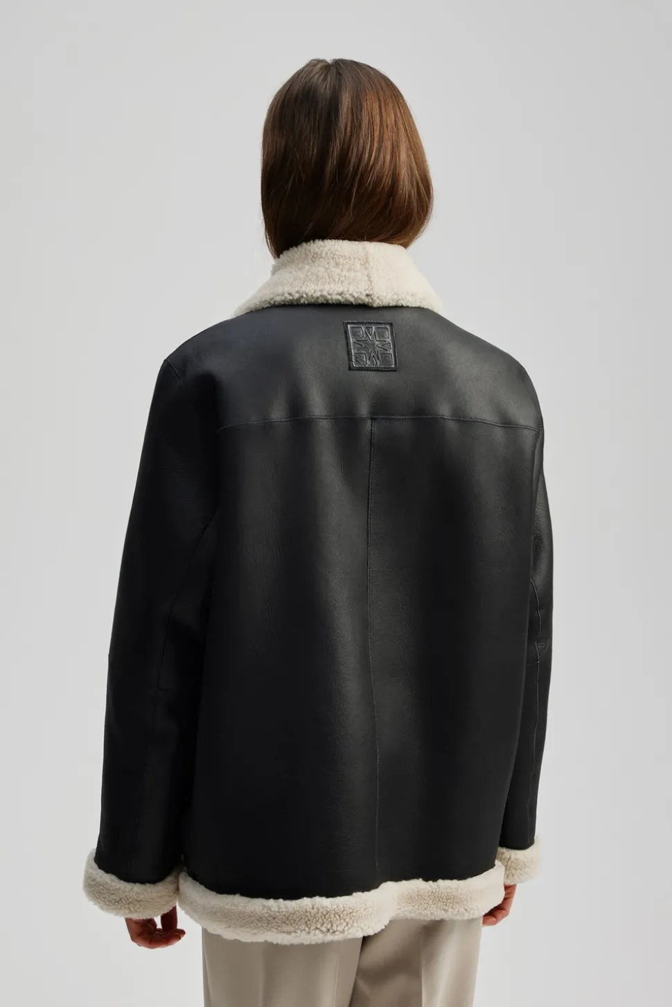 Jacka i lammskinn med detaljer i lammskinnspäls. Denna läckra jacka har en rak passform med fickor och krage, allt i shearling-foder såsom ärmsluten och jackans nedre kant.