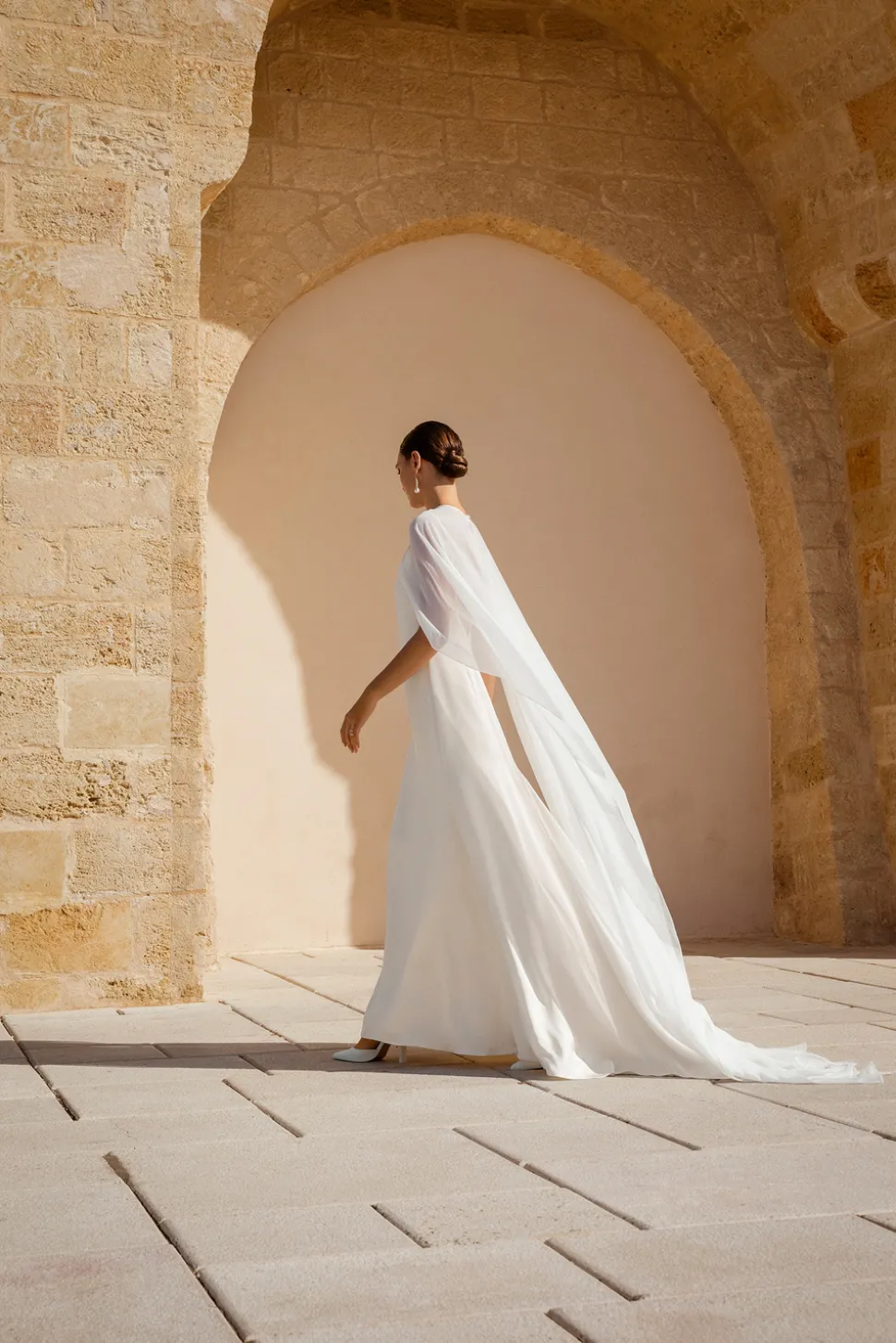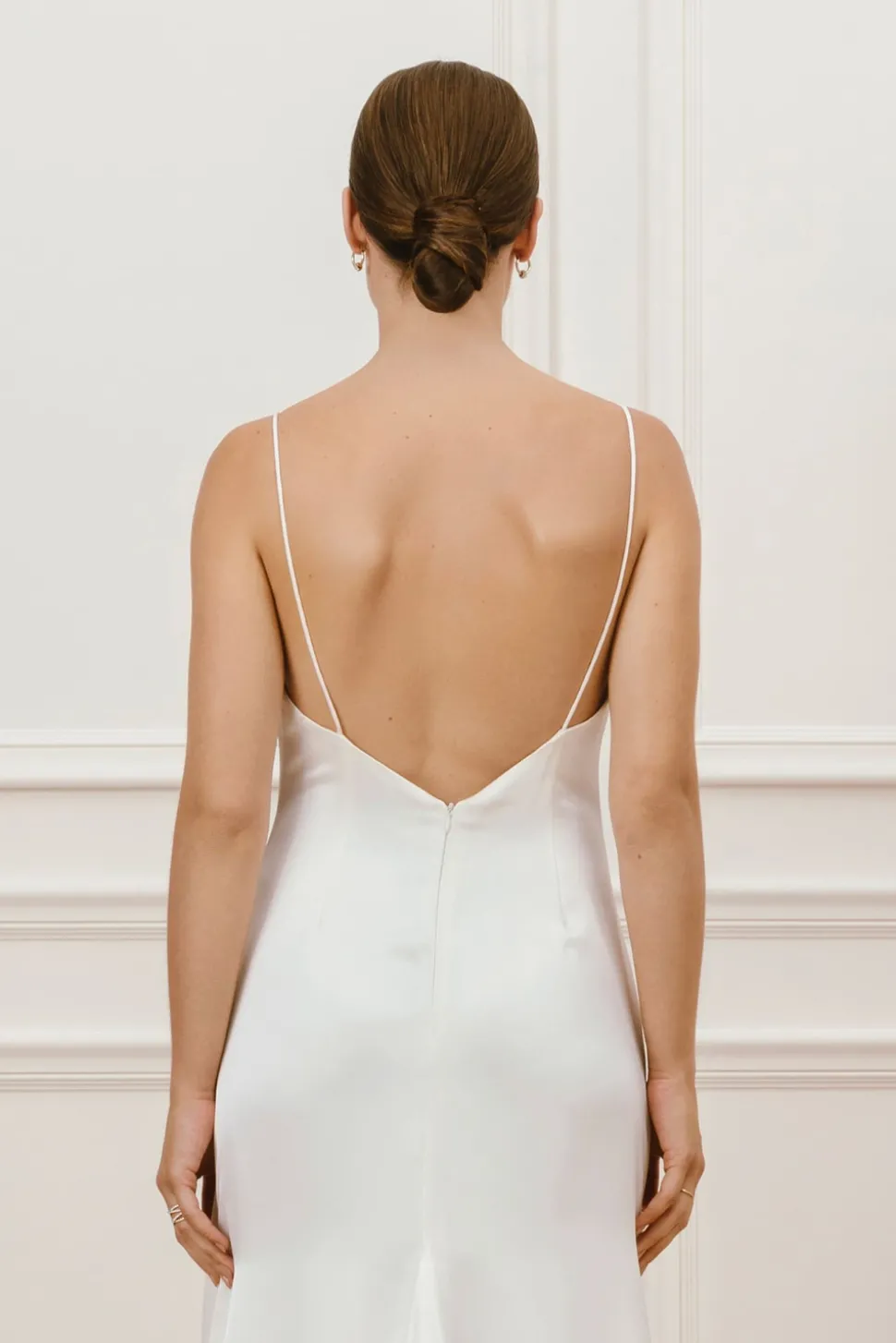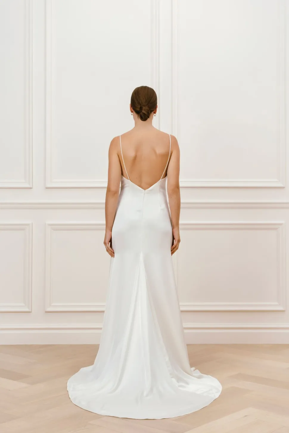 Bröllopsklänning med draperad ringning och tunna band. Klänningen har ett material med lyster, en djup öppen rygg och ett mindre släp.