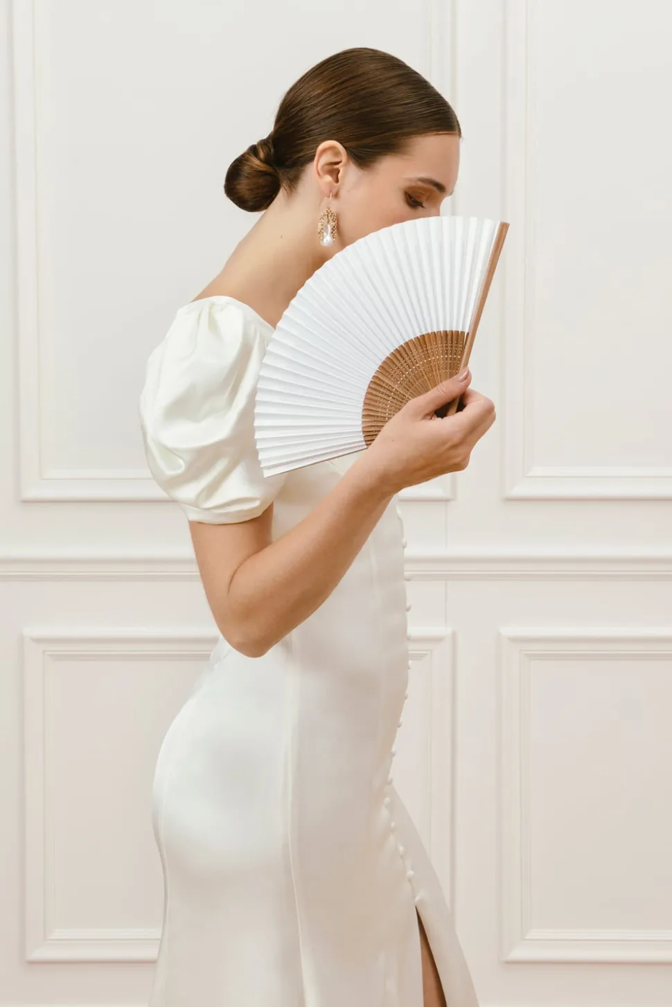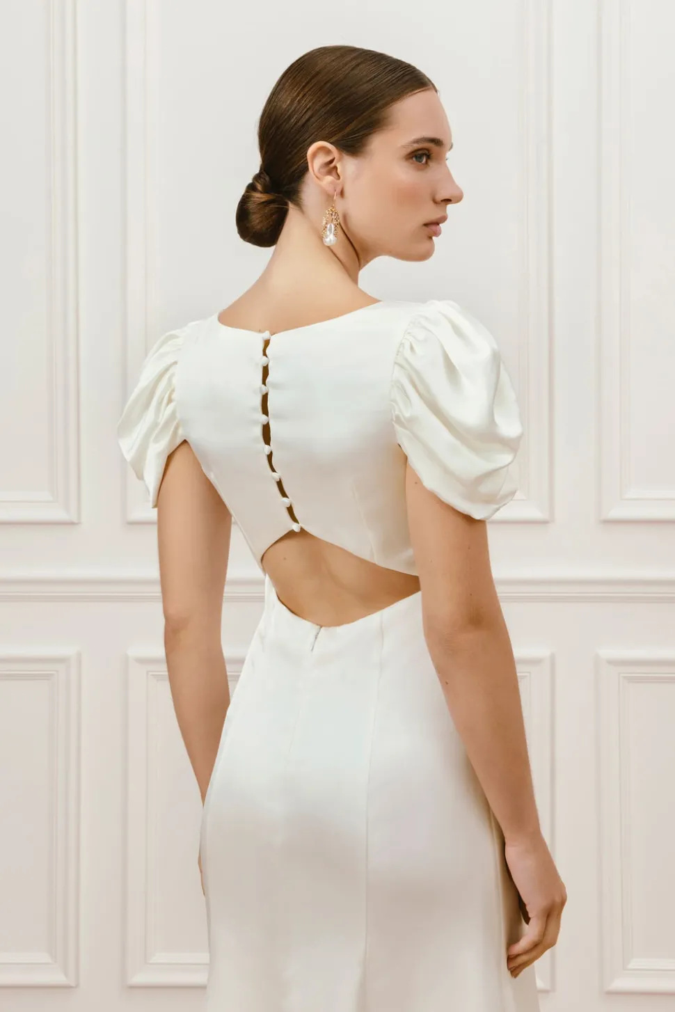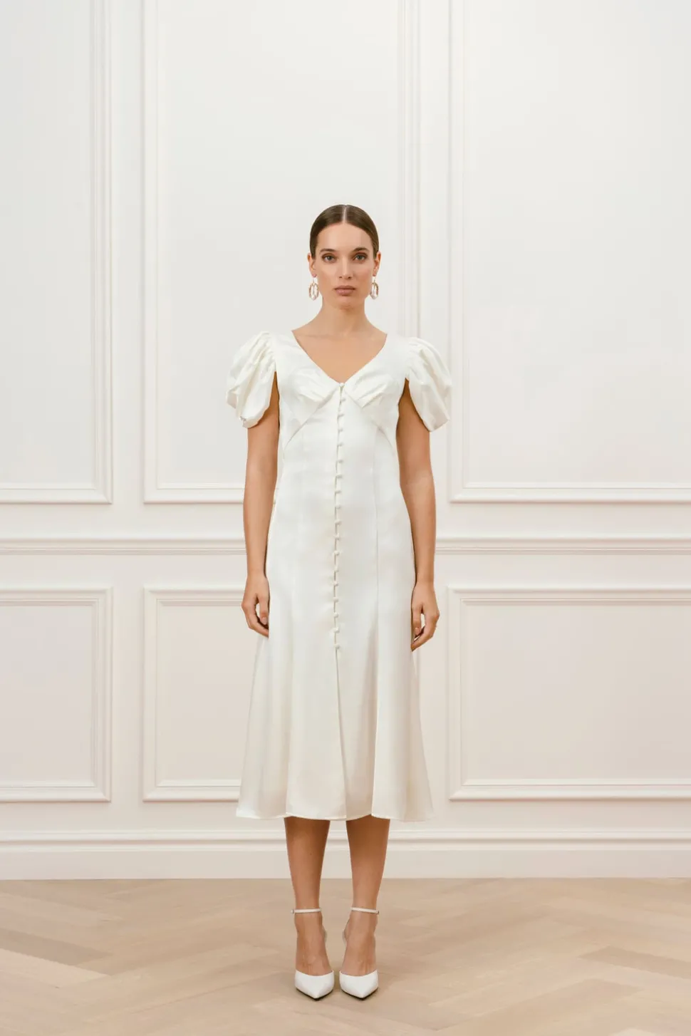 Elegant och enkel midklänning med vackra knappar, puffärmar och den sötaste urringningen.