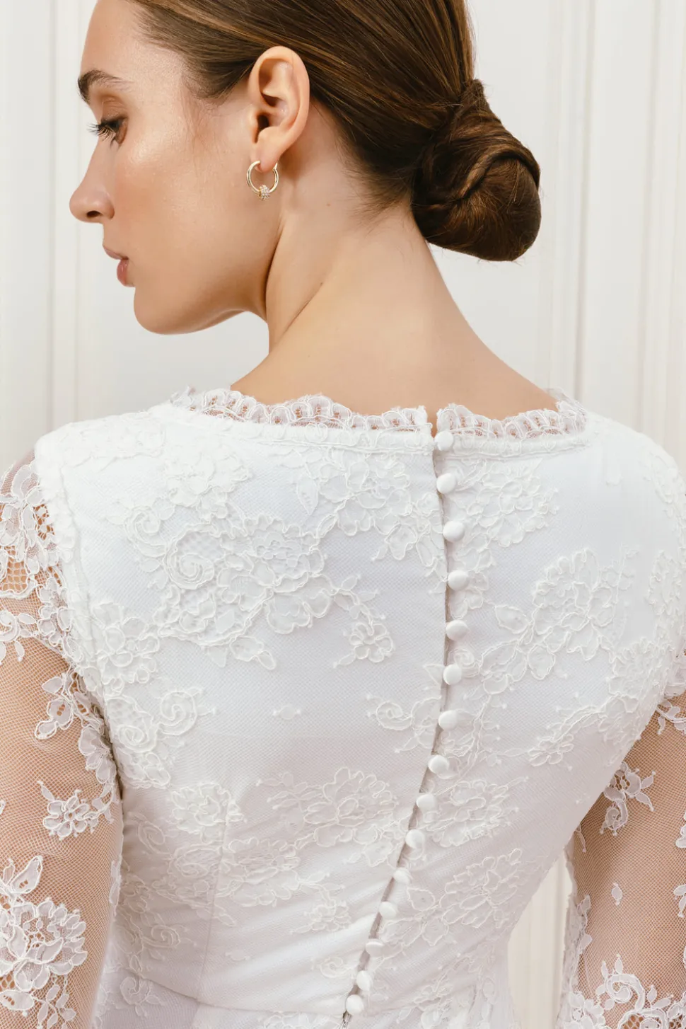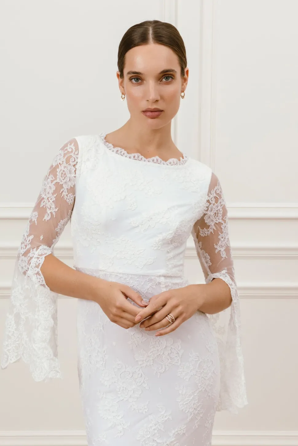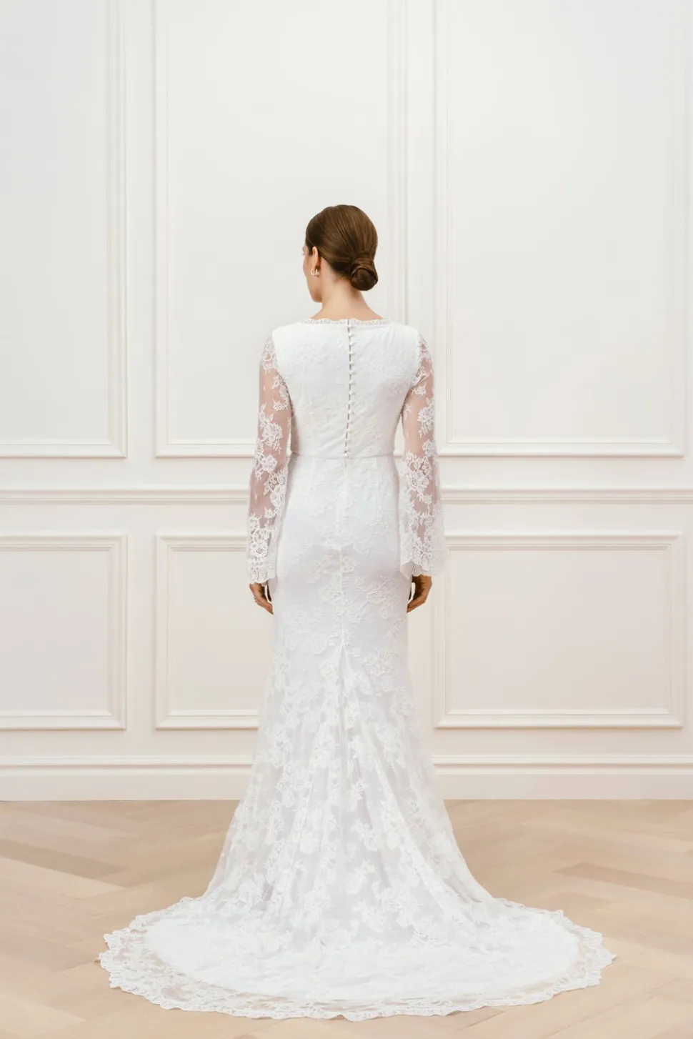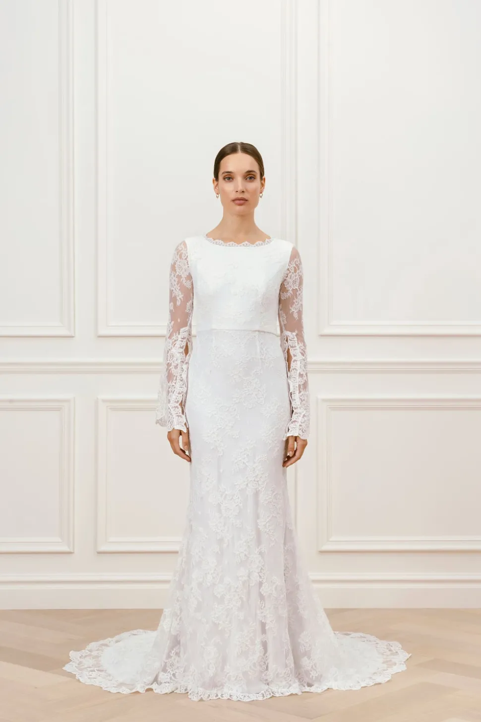 Spetsklänning med hjärtformad ringning med en lyxig tunn spets. De långa ärmarna har en slit och vackra spetsdetaljer. Stängd rygg och ett vackert släp.
