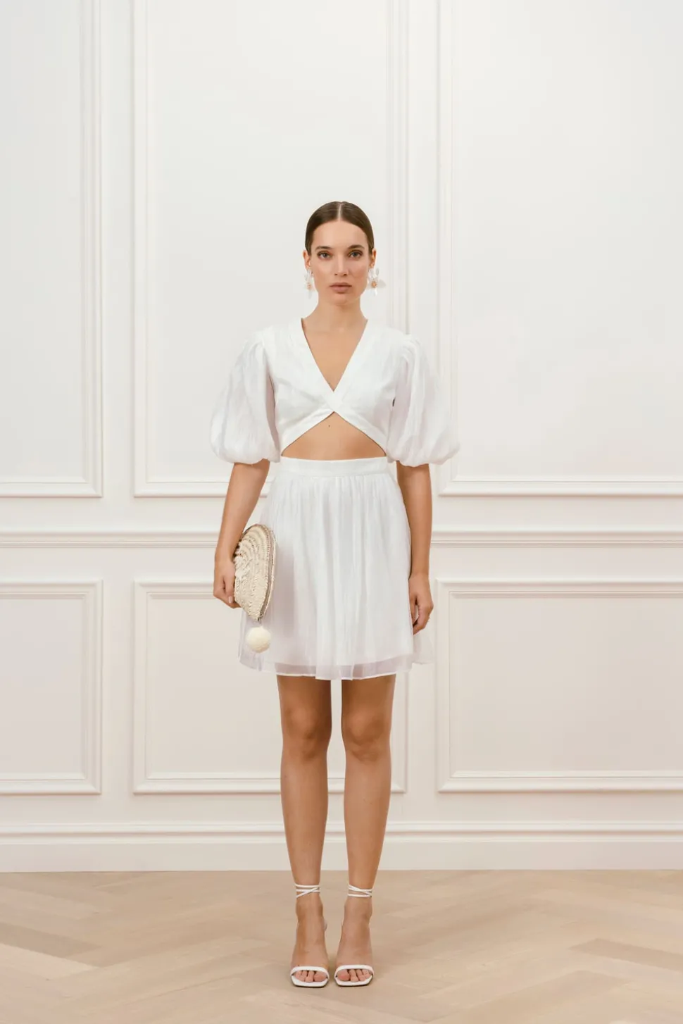 Kort klänning med moderna utskärningar, stängd rygg och puffärmar. V-ringad med en smickrande silhouette.