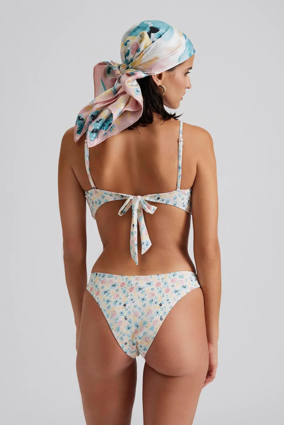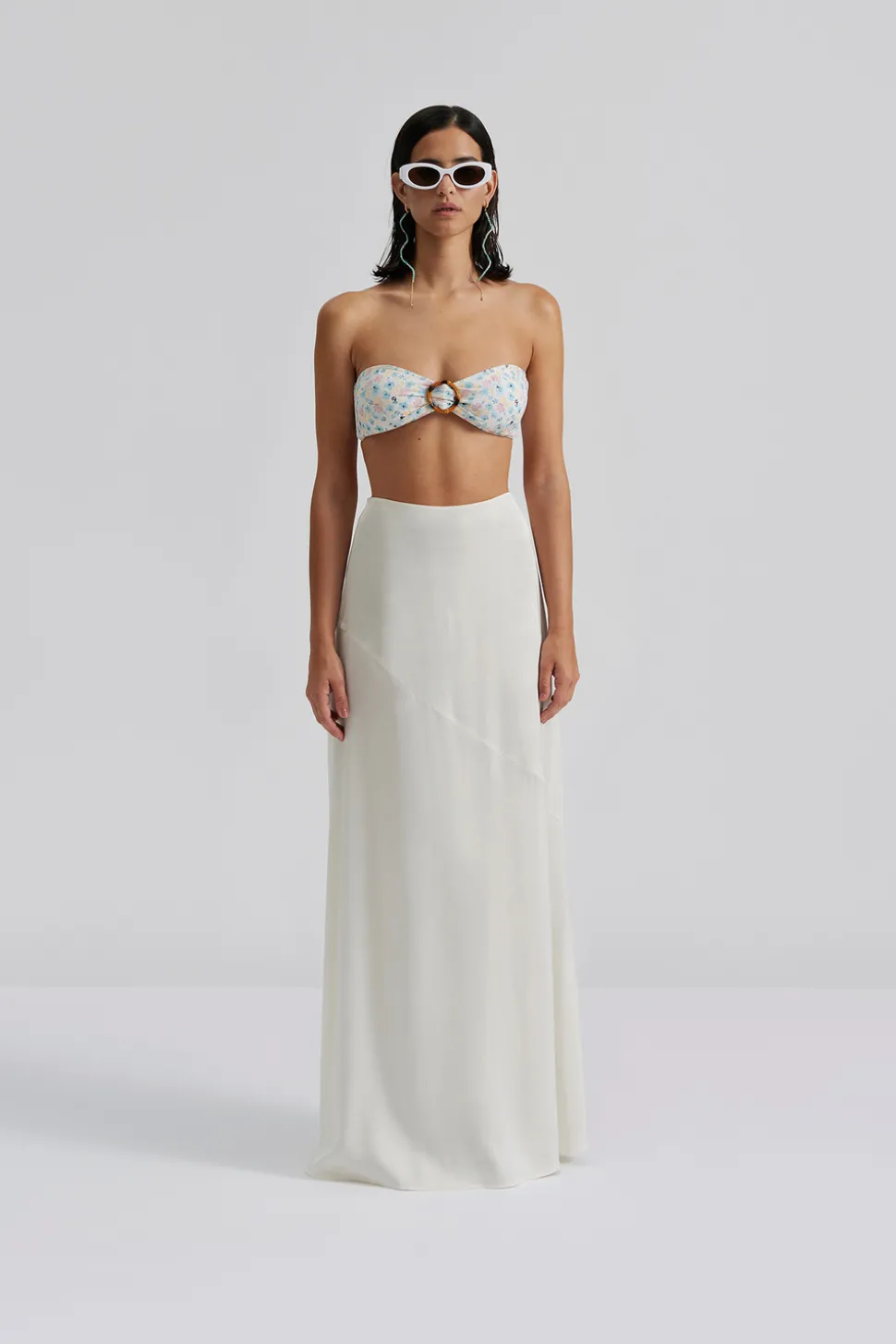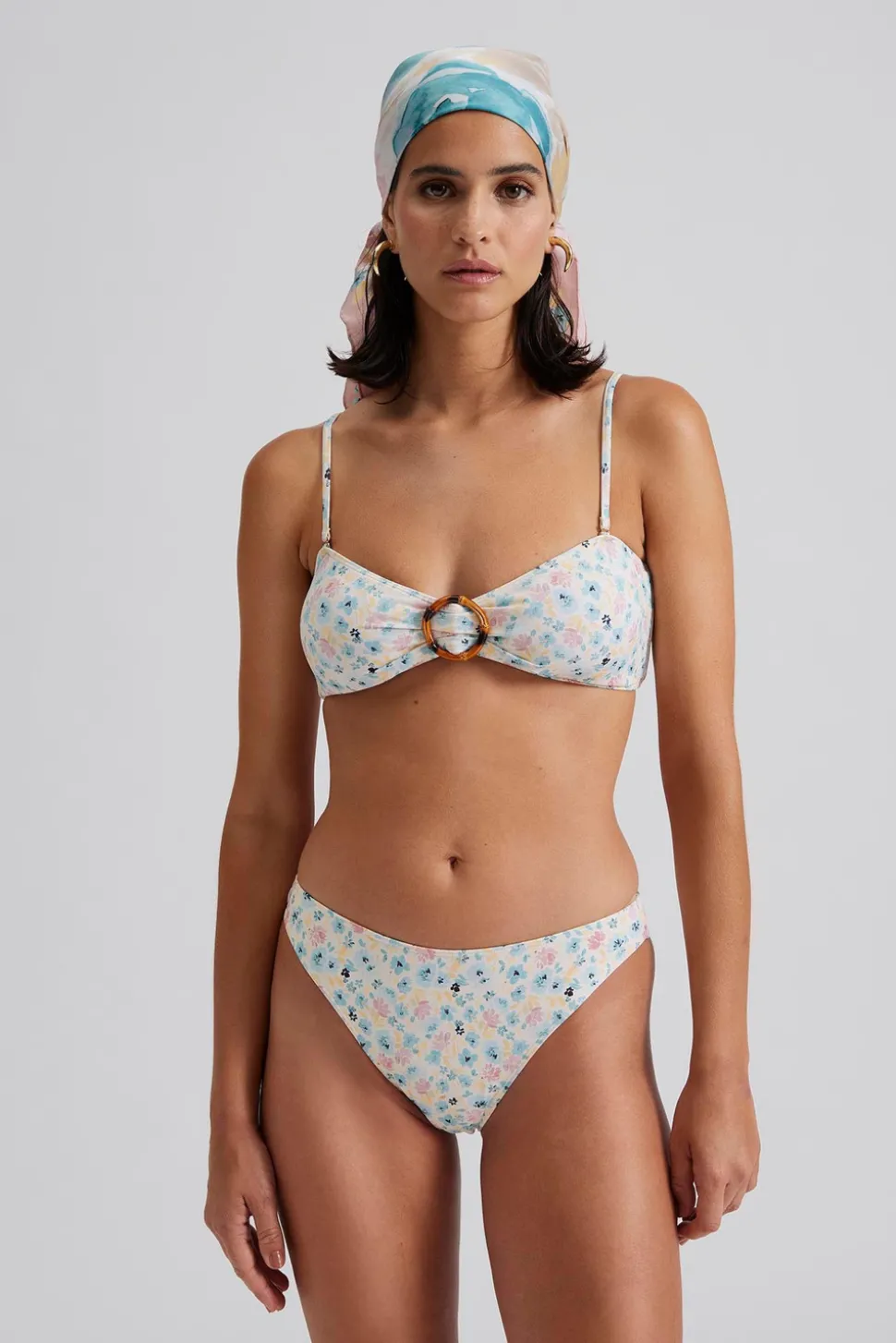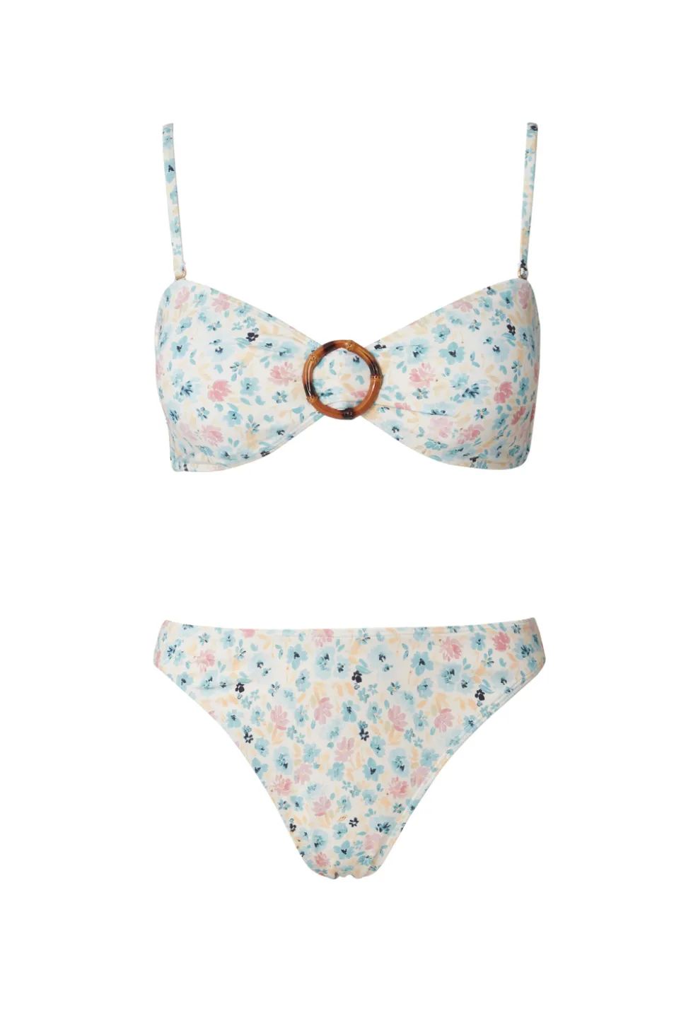 Blommig axelbandslös bikinitopp med ringdetalj i bambu framtill.